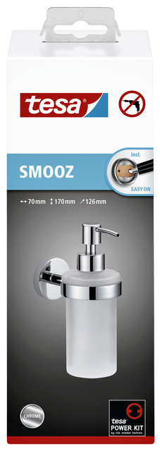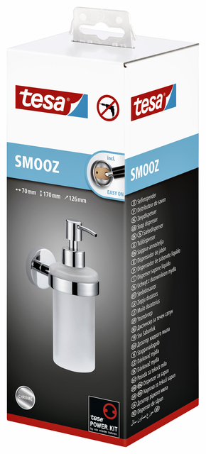 * Met de tesa® Smooz hand zeeppomp kun je je zeep krijgen uit een aantrekkelijk ontworpen dispenser in chroom en gesatineerd glas. Dankzij de zelfklevende oplossing die wordt gebruikt bij de montage, kan hij overal worden geplaatst waar hij het beste kan worden bereikt. * Omdat er geen boren of extra gereedschap nodig is, blijven wanden en tegels onbeschadigd. * De lijm heeft 12 uur droogtijd nodig om een sterke hechting te ontwikkelen. * De dispenser kan zonder lijmresten worden verwijderd en met adapter BK20 elders opnieuw worden gebruikt. * Afmeting 170x70x126mm. * Lees voor montage of uw wand hiervoor geschikt is.