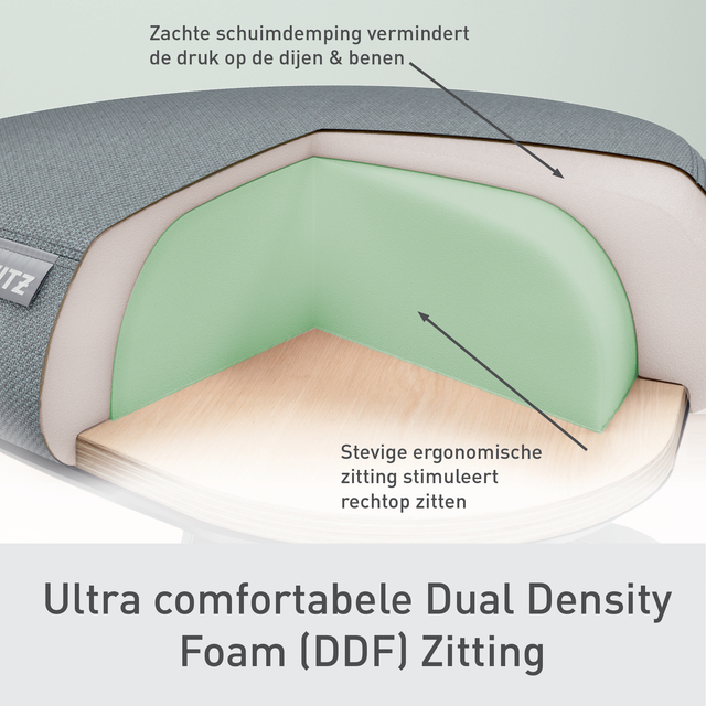 * De Leitz Ergo wiebelkruk met gasveer heeft een unieke DDF-comfortzitting (Dual Density Foam) met een stevige ergonomische kern. De driehoekige vorm lijkt op een zadelkruk, verdeelt het gewicht gelijkmatig over het bekken en is omgeven door zacht schuim om de druk op de dijen en benen te verminderen. De 9cm dikke zitting is ontworpen voor comfort en kan worden gebruikt om te leunen of volledig te zitten. Dit stimuleert gebruikers om meer rechtop te zitten en biedt een ultracomfortabele zitervaring die lijkt op een zitkussen. Deze in hoogte verstelbare ergonomische kruk is ontwikkeld in samenwerking met het Instituut voor Gezondheid en Ergonomie (IGR) en is ontworpen om je thuis of op het werk actief te houden terwijl je staat achter een stabureau, hoge vergadertafel, aanrecht of zit achter een gewoon bureau. De afgeronde schommelende basis van de wiebelkruk stimuleert actieve beweging door te draaien terwijl je werkt, wat je rug en core versterkt en pijn voorkomt. * Producteigenschappen; * Soepel en eenvoudig 25cm in hoogte verstelbaar (57 - 82cm) met één druk op de knop om de perfecte stahoogte in te stellen. * De bekleding van de zitting is gemaakt van 100% gerecycled materiaal en de rubberen antislipvoet zorgt ervoor dat de kruk niet wegglijdt en beschermt de vloer. * Door het lichtgewicht ontwerp en de draaggreep onder de zitting is hij gemakkelijk van kamer naar kamer te verplaatsen en kan hij gemakkelijk onder een bureau worden opgeborgen. * Dankzij het lichtgewicht ontwerp en de draaggreep onder de zitting kan de stoel gemakkelijk van kamer naar kamer worden verplaatst en is geschikt voor een gewicht tot 110kg.