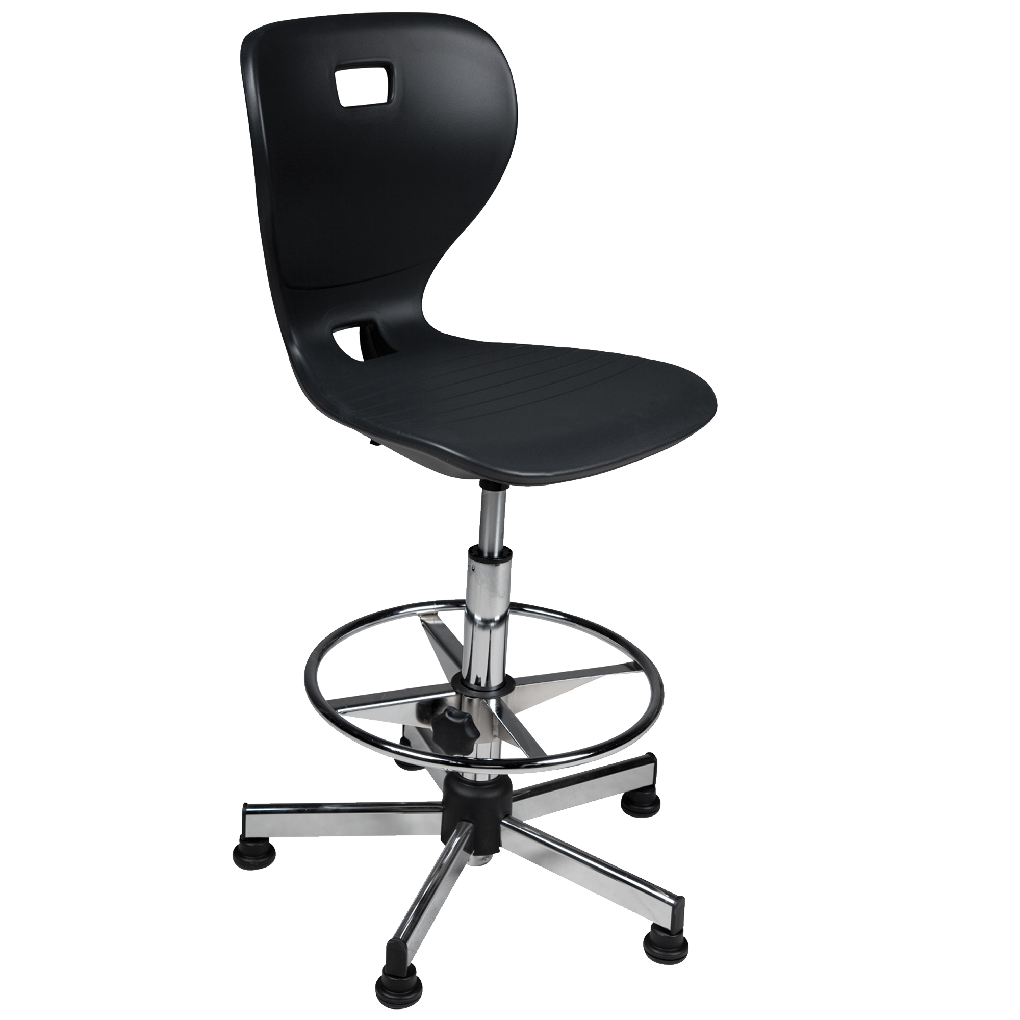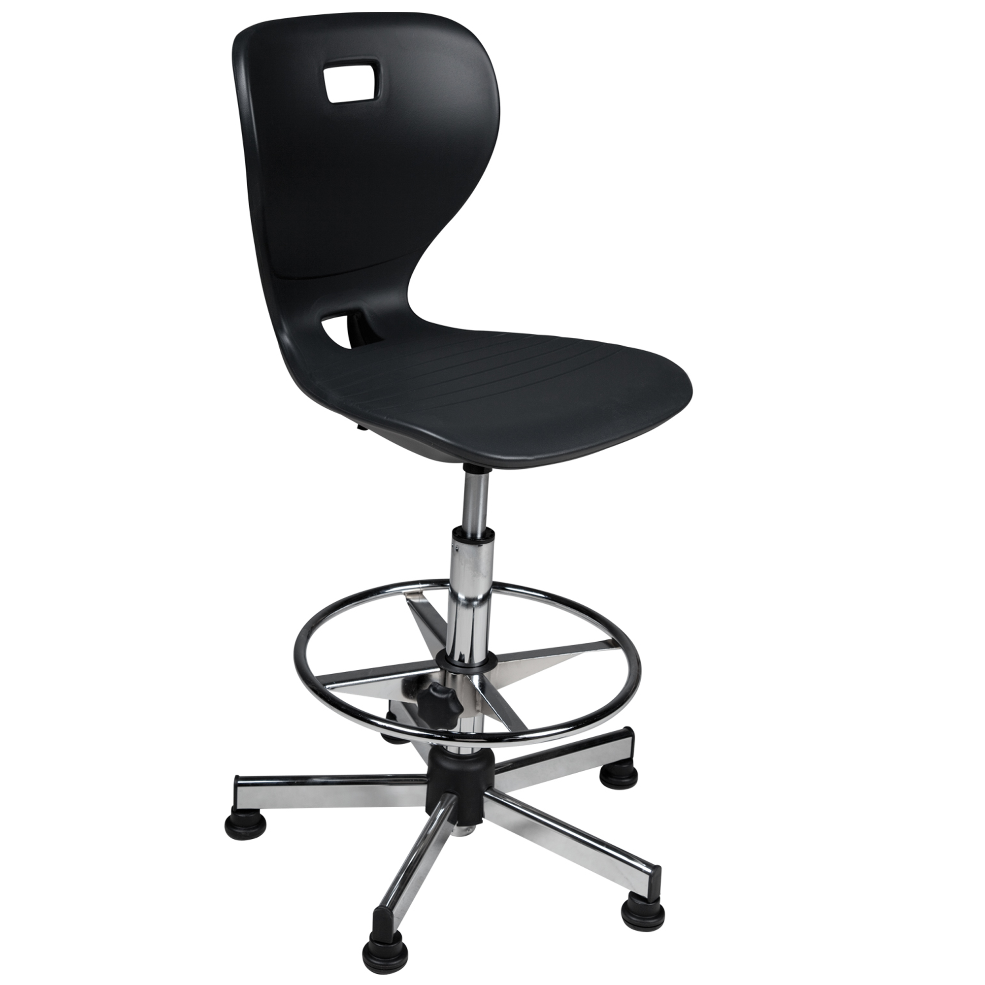 De Ergostar Counter is een ergonomische leerlingstoel en heeft een stevige chromen voetring die in hoogte verstelbaar is. De 5 grote glijders op een chromen onderstel zorgen voor een stevige stand.Naast de in hoogte verstelbare voetring is de schoolstoel traploos in zithoogte te verstellen door middel van een LGA-geteste veiligheidsgasveer. De dubbelwandige zitschaal van kunststof, verkrijgbaar in verschillende frisse kleuren, zorgt voor een licht luchtkusseneffect. Dankzij de twee handgreepgaten die in de rugleuning zijn geïntegreerd, kan de schoolstoel praktisch en gemakkelijk worden vervoerd. Het oppervlak van de Ergostar sledestoel is perfect schoon te maken en daardoor zeer hygiënisch.