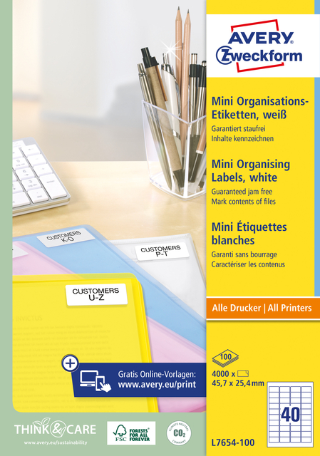 Of u nu wilt adresseren of organiseren, Avery heeft altijd de juiste etiketten voor al uw toepassingen en helpt u tijd te besparen zowel thuis als op het werk. Zie hieronder het Avery assortiment. Met de gratis Avery Templates & Software, kunt u makkelijk uw etiketten opmaken en personaliseren of uw adressenbestand toevoegen.