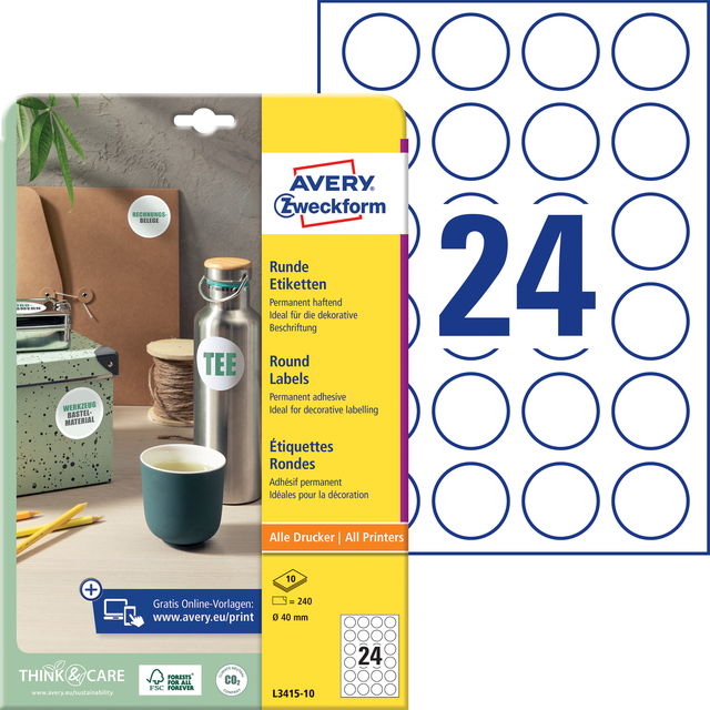 * Voor een bijzondere uitstraling! * Deze witte, kleine ronde etiketten van Avery kunt u voor verschillende toepassingen gebruiken. * Perfect in te zetten als productetiketten op jam- of cosmeticapotten, deksels, glaasjes of verpakkingen. * Voorzie ze van uw eigen logo en productinhoud en klaar is uw professionele etiket. * Ook ideaal om in te zetten voor promotiedoeleinden en natuurlijk voor alle andere markeringen die op moeten vallen. * De zelfklevende etiketten met een diameter van 40 mm zijn eenvoudig te bedrukken met behulp van de Avery online software en templates. * Ze zijn praktisch in gebruik op zowel het werk of thuis. * Tevens ideaal voor het etiketteren van kantoorbenodigdheden, mappen, documenten of opbergdozen. * U bent verzekerd van een betrouwbare kleefkracht waardoor deze etiketten uitstekend plakken op uiteenlopende ondergronden zoals glas, karton, papier of plastic. * Milieuvriendelijk: Het materiaal van deze chloorvrij gebleekte etiketten is gemaakt van 100% FSC®-gecertificeerd papier uit duurzaam beheerde bossen. * U kunt vertrouwen op een gegarandeerd storingsvrije printerdoorvoer zonder lijmvloeiing in uw printer. * Deze etiketten kunnen op alle gangbare laser- en inkjetprinters worden bedrukt. * Met Avery Design & Print Online kunt u de etiketten snel een eenvoudig vormgeven en printen. * Gewoon het artikelnummer invoeren, ontwerpen, printen en klaar!