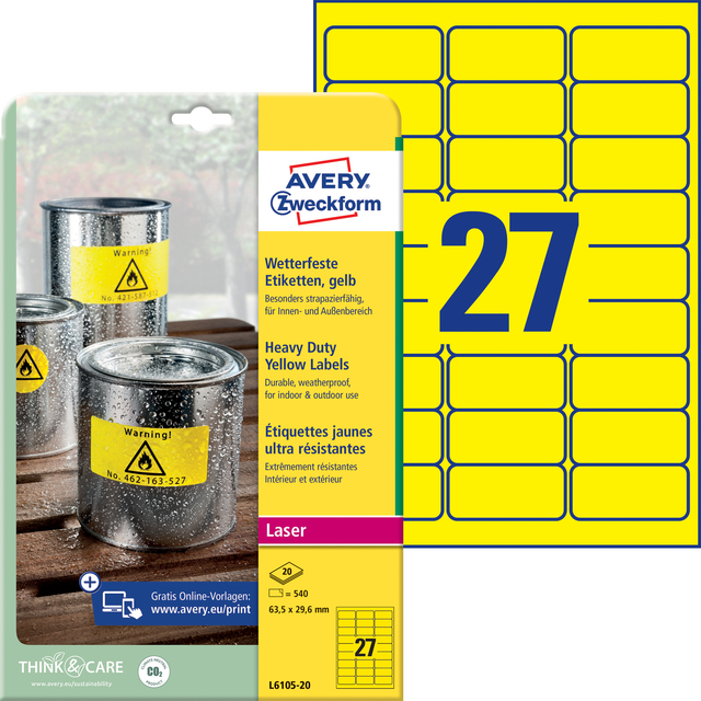 Eigenschappen "Etiket Avery Zweckform L6105-20 63.5x29.6mm geel 540stuks"