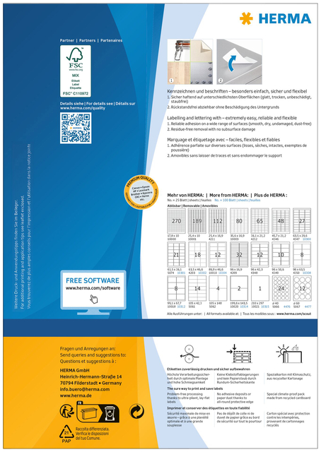 Herma is een toonaangevende fabrikant van zelfklevende etiketten en etiketteersystemen. Het bedrijf is opgericht in 1906 in het Duitse Stuttgart en heeft zich sindsdien ontwikkeld tot een wereldwijde speler op het gebied van labeloplossingen. Het merk staat bekend om zijn hoogwaardige producten en innovatieve oplossingen voor een breed scala aan toepassingen.