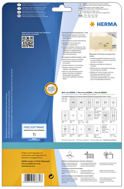 Herma is een toonaangevende fabrikant van zelfklevende etiketten en etiketteersystemen. Het bedrijf is opgericht in 1906 in het Duitse Stuttgart en heeft zich sindsdien ontwikkeld tot een wereldwijde speler op het gebied van labeloplossingen. Het merk staat bekend om zijn hoogwaardige producten en innovatieve oplossingen voor een breed scala aan toepassingen.