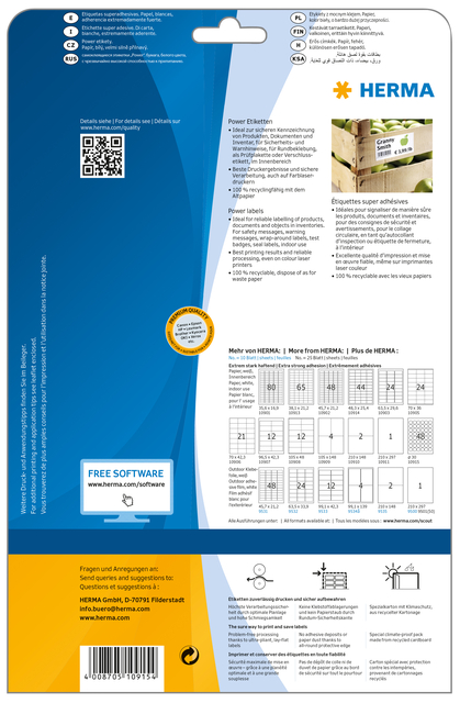 Herma is een toonaangevende fabrikant van zelfklevende etiketten en etiketteersystemen. Het bedrijf is opgericht in 1906 in het Duitse Stuttgart en heeft zich sindsdien ontwikkeld tot een wereldwijde speler op het gebied van labeloplossingen. Het merk staat bekend om zijn hoogwaardige producten en innovatieve oplossingen voor een breed scala aan toepassingen.