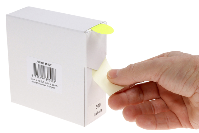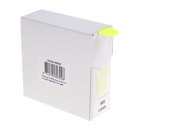 * Fluor gele ronde etiketten in kartonnen dispenser. * 500 etiketten per rol. * Doorsnede 25 mm
