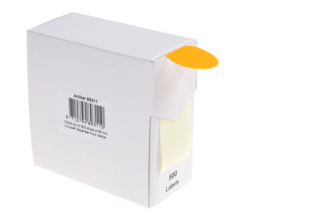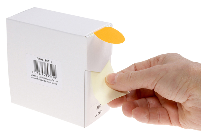 * Fluor oranje ronde etiketten in kartonnen dispenser. * 500 etiketten per rol. * Doorsnede 35 mm
