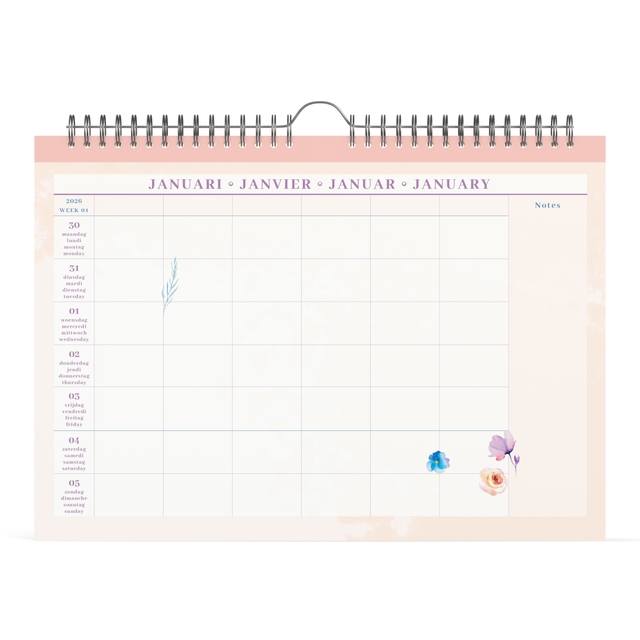 Familiekalender 2026 Lannoo 310x220 Flowers watercolour 7dag/1pag lila