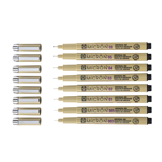 * De favoriete fineliners van ontwerpers, Pigma Microns, zijn nu verkrijgbaar in een speciale Black Edition. Mis deze stijlvolle, volledig zwarte versie van de iconische pen met de betrouwbare zwarte Pigma-inkt niet! * Pigma Micron-pennen zijn watervaste, permanente fineliners die trouw worden gebruikt door designers, wetenschappers, archivarissen, mangatekenaars, cartoonisten, illustratoren en hobbyisten. Het is de aanbevolen pen voor Zentangle. De fijne punt maakt deze pen ideaal voor zowel technische als artistieke tekeningen. PIGMA Micron is verkrijgbaar in tien verschillende puntdiktes en diverse kleuren voor precieze lijntjes met archiefwaardige inkt. * Deze set bevat Pigma Micron fineliners in alle verkrijgbare maten: 1 x 003 (0.15 mm), 1 x 005 (0.2 mm), 1 x 01 (0.25 mm), 1 x 02 (0.30 mm), 1 x 03 (0.35 mm), 1 x 04 (0.40 mm), 1 x 05 (0.45 mm), 1 x 08 (0.50 mm), 1 x 10 (0.60 mm), 1x 12 (0.70 mm) en een gratis vilten etui. * De etui is stevig en duurzaam ontwikkeld, gemaakt van gerecycled polyester. Voorzien van een donkergrijze melange textuur, een drukknoop en een chick Sakura-label. De perfecte aanvulling op de dagelijkse benodigdheden van elke illustrator. Deze handige etui is makkelijk in gebruik en klein genoeg om in een jaszak of tas mee te nemen; een geweldig accessoire voor kunstenaars die veel onderweg zijn.