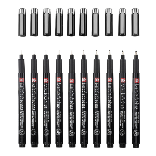 * Pigma Micron-pennen zijn watervaste, permanente fineliners die trouw worden gebruikt door designers, wetenschappers, archivarissen, mangatekenaars, cartoonisten, illustratoren en hobbyisten. * Het is de aanbevolen pen voor Zentangle. De fijne punt maakt deze pen ideaal voor zowel technische als artistieke tekeningen. * De unieke Sakura Pigma-inkt loopt niet door papier en is permanent, watervast, sneldrogend, pH-neutraal en loopt niet uit. * Deze set bestaat uit 10 zwarte Pigma Micron-pennen met alle verkrijgbare puntdiktes uit dit assortiment: 1 x 003 (0,15mm), 1 x 005 (0,2mm), 1 x 01 (0,25mm), 1 x 02 (0,30mm), 1 x 03 (0,35mm), 1 x 04 (0,40mm) 1 x 05 (0,45mm), 1 x 08 (0,50mm), 1 x 10 (0,60 mm), 1x 12 (0,70mm).