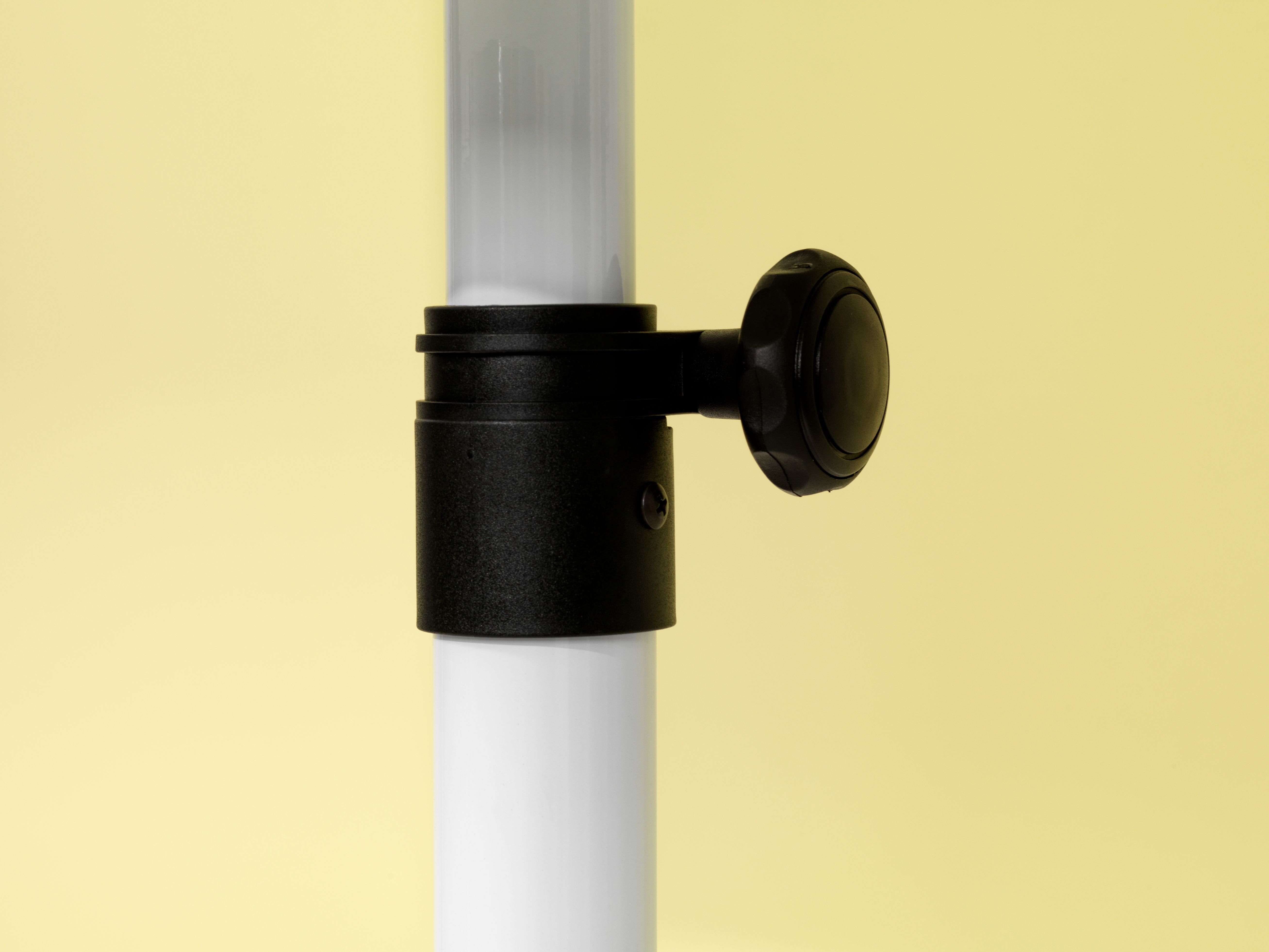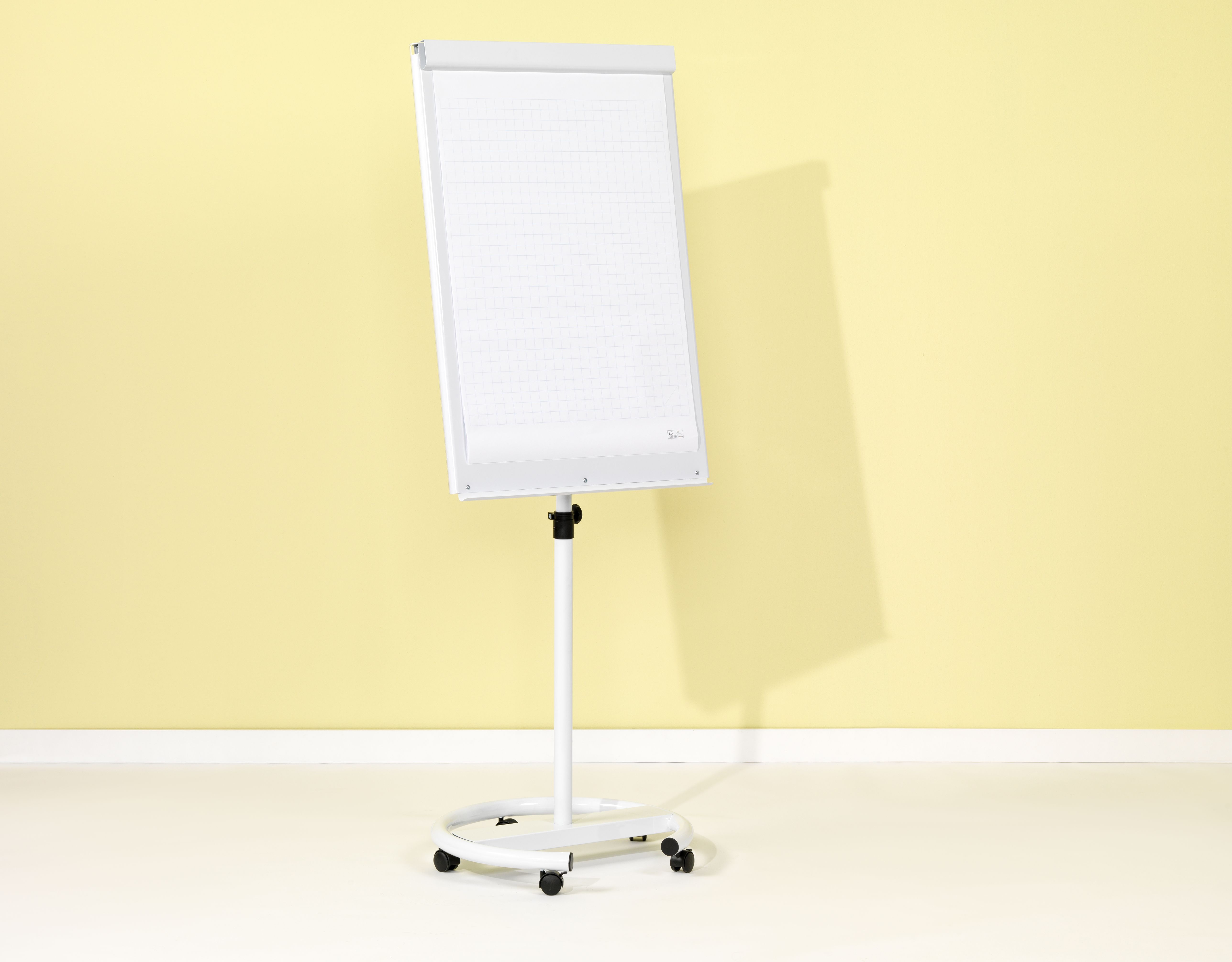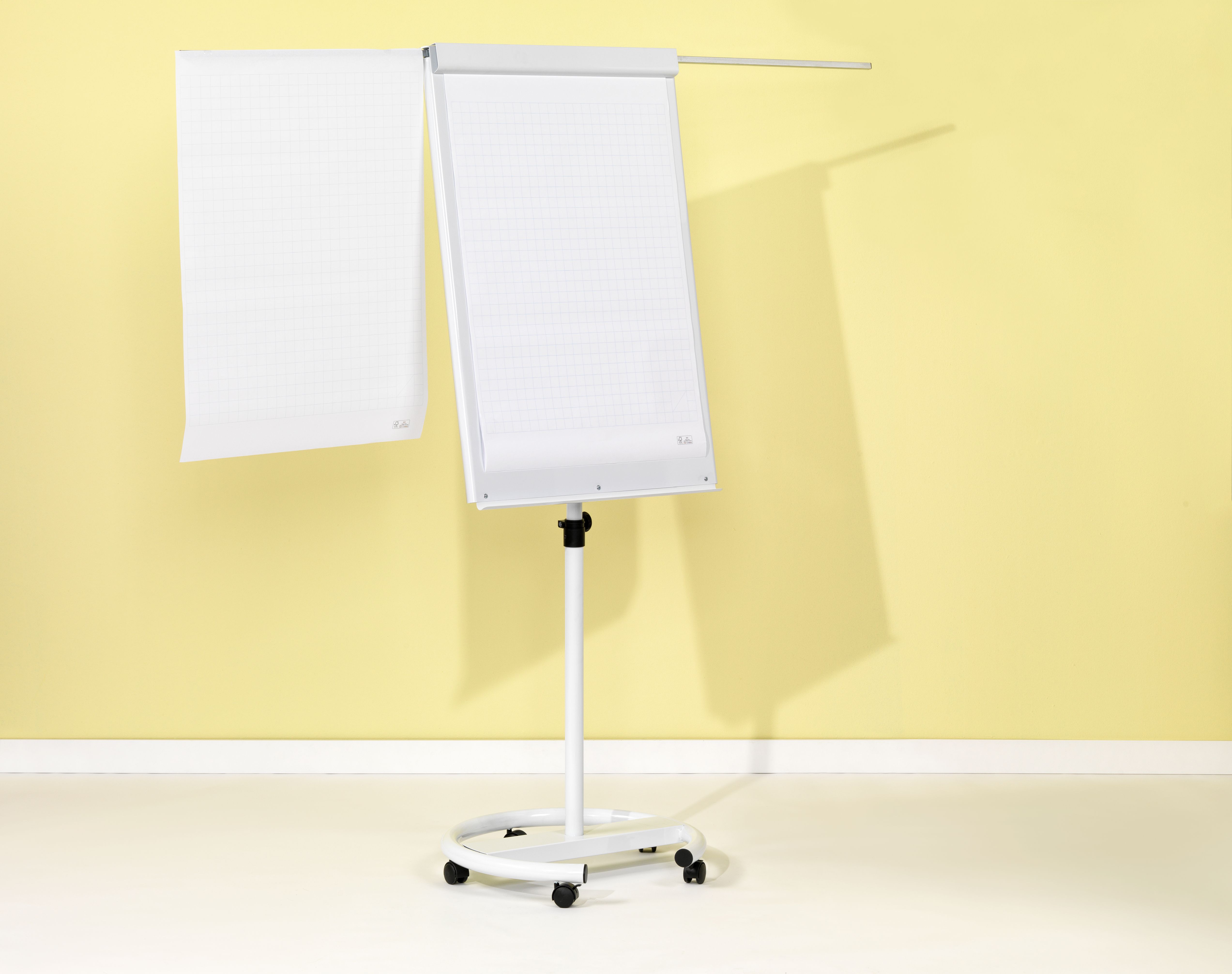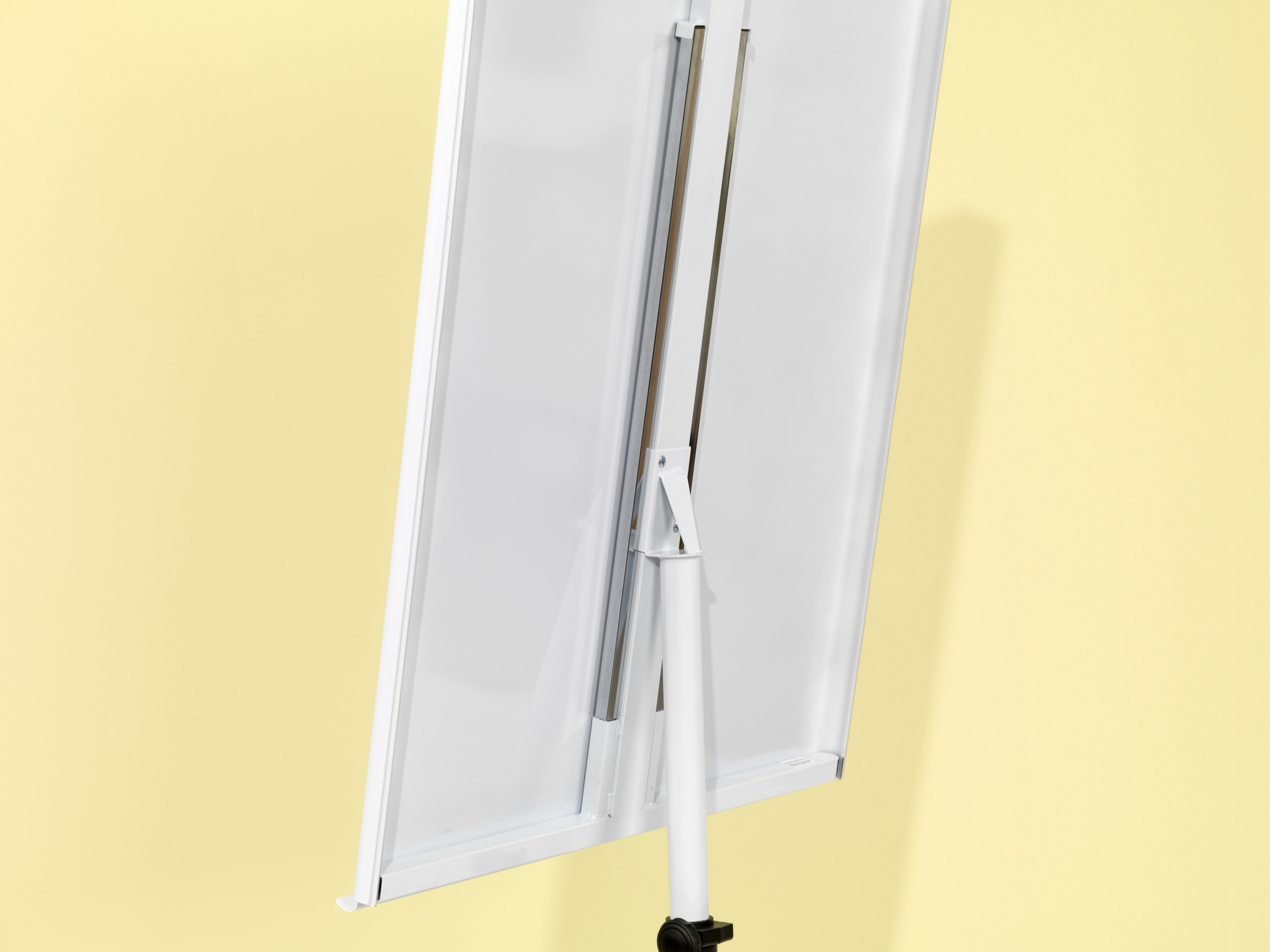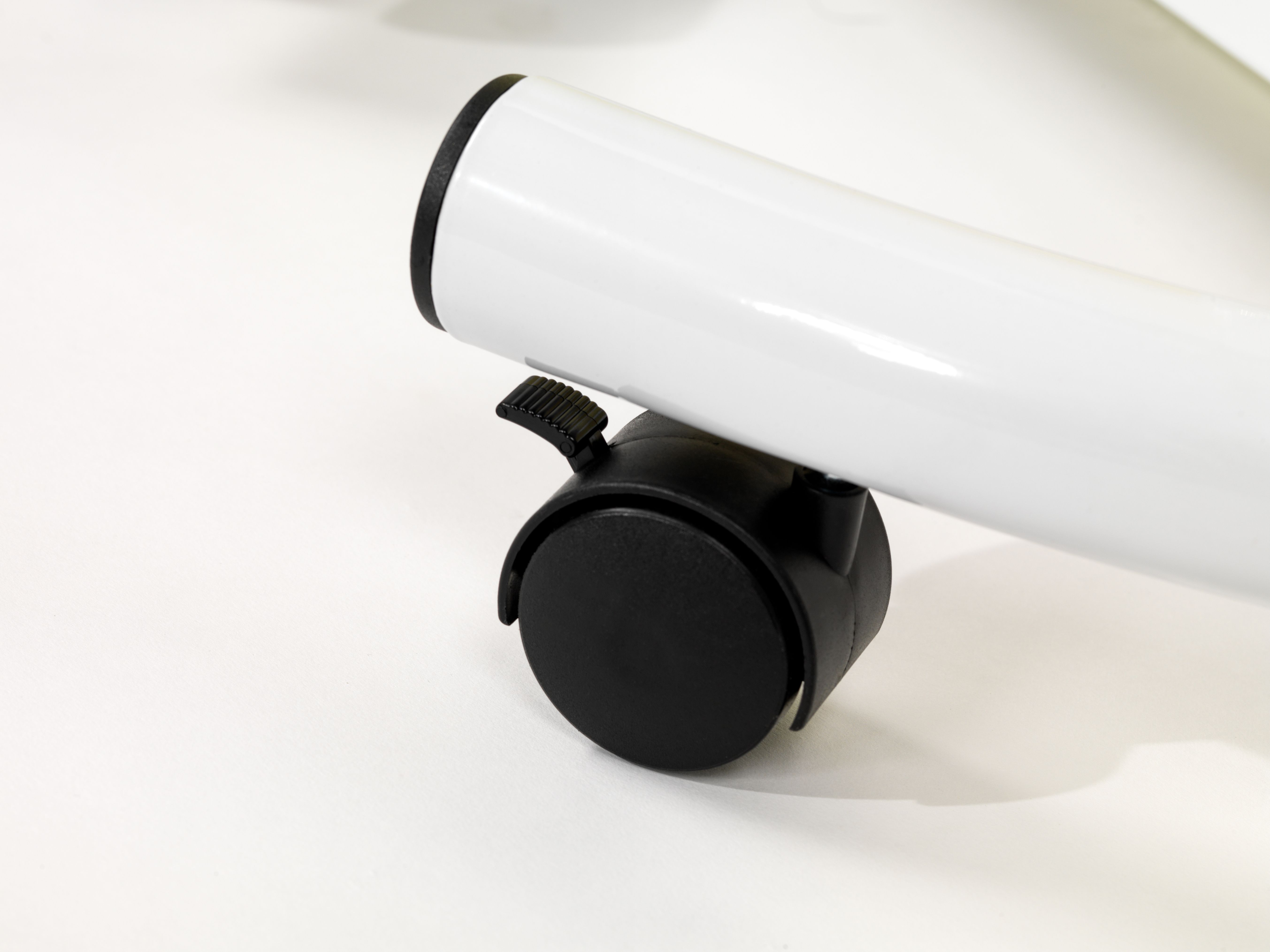 Flip-over met snelklem en flexibele ophangpunten. Achterpaneel van gelakt staal. Voorzien van een veer voor hoogte- instelling, twee zijarmen voor extra ophangmogelijkheden en een ronde voet op 5 wielen (3 met rem) met instap opening.