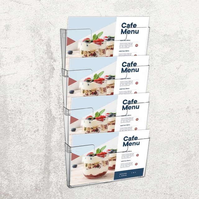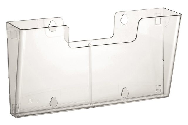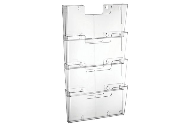 * Wandfolderhouder van glashelder polystyreen. * Koppelbaar door middel van innovatief koppelsysteem. * Zowel onder als naast elkaar uitbreidbaar. * Set van 4 folderbakjes. * Geschikt voor papierformaat A4.