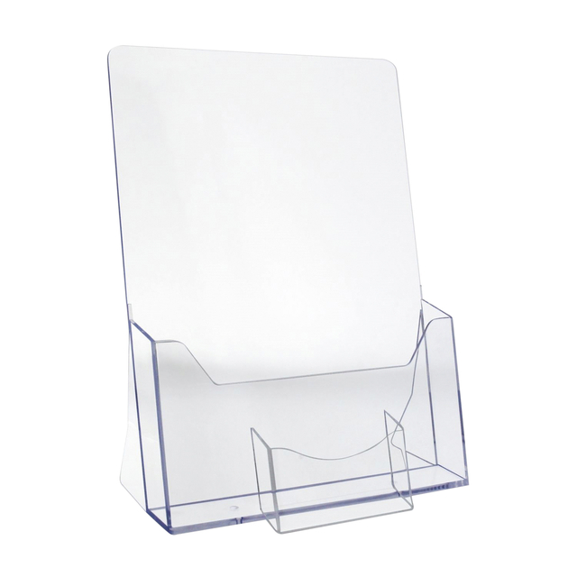 * Folderbakje voor een glasheldere presentatie van folders, catalogi en prijskaarten. * Stevig en glashelder hoogwaardig kunststof. * Capaciteit 35mm. * Voorzijde voorzien van visitekaarthouder, capaciteit 20mm.