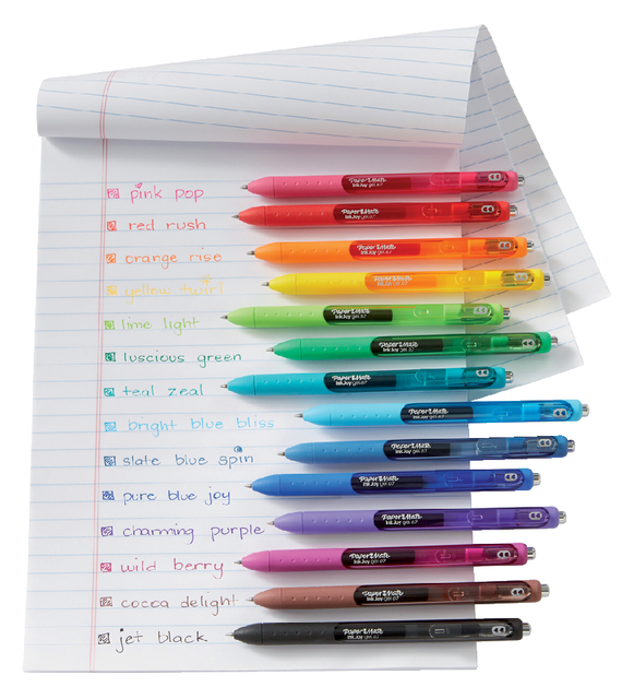 * Eindelijk een gel pen waar je blij van wordt, een gel pen die niet veegt. * Gelpennen schrijven zeer vlot en mooi met hun levendige en uitgesproken lijnen, vaak zijn de inktvlekken echter de spelbreker.* Dus wat je ook schrijft, waar je ook aan werkt, het wordt plots veel leuker met deze unieke pennen. * Fleur je schrijven, je tekenen op, spread Joy met de Paper Mate Inkjoy gelpen.
