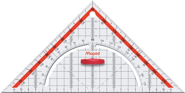 * Stabiele geodriehoek met vaste grip (16cm) of afneembare grip (26cm). * Door de grip is de driehoek gemakkelijk van de tafel te pakken. * Hypotenusa 16 of 26cm. * Heeft 4 functies in 1: gekalibreerde driehoek, het tekenen van symmetrische lijnen, het tekenen van parallelle lijnen en het is een gradenboog. * Per stuk in een zakje met ophangoog.