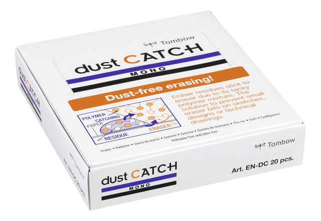 * De MONO dust CATCH vangt zijn eigen resten op: kleine gumdeeltjes blijven aan de gum kleven en blijven dankzij een speciale polymeerformule niet op het papier achter. Dit zorgt voor een bijzonder schone gumervaring en voorkomt dat tekeningen onbedoeld worden beschadigd door gumresten. Het omhulsel is gemaakt van meer dan 50% gerecycled papier. Materiaal: PVC-, ftalaat- en latexvrij. Kenmerken: * Geschikt voor potloden * Soort materiaal: PVC zonder ftalaten en latex * Omhulsel: 50% gerecycled papier * Stofvrij