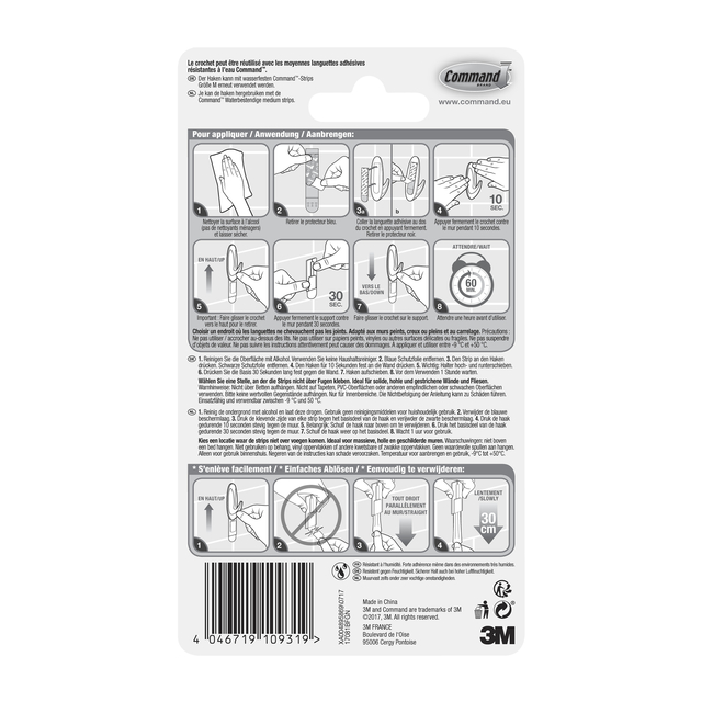 * De Command™ Middelgrote designhaken voor badkamers worden geleverd met waterbestendige strips; zij zijn onze innovatieve oplossing voor het veilig en zonder beschadiging ophangen van badkameraccessoires, schoonmaakmiddelen en andere middelzware voorwerpen in natte en vochtige ruimten. Ze hechten sterk en laten na verwijdering geen sporen achter dankzij de 3M rekontgrendelingstechnologie. * Hangt zonder beschadigingen op, hecht stevig en laat na verwijderen geen sporen achter. * Gemakkelijk aan te brengen: er zijn geen spijkers, schroeven of boren nodig. * De strips laten zich door uitrekken schoon verwijderen zonder gaten, vlekken of lijmresten achter te laten. * Geschikt voor de meeste gladde oppervlakken, zoals geschilderde wanden, tegels en glas. * Waterbestendige strips zijn effectief in natte en vochtige omstandigheden. Ideaal voor gebruik op tegels, om boren en schade aan de tegels te voorkomen. * Draagvermogen: 1,3 kg. * Formaat: Middelgroot.
