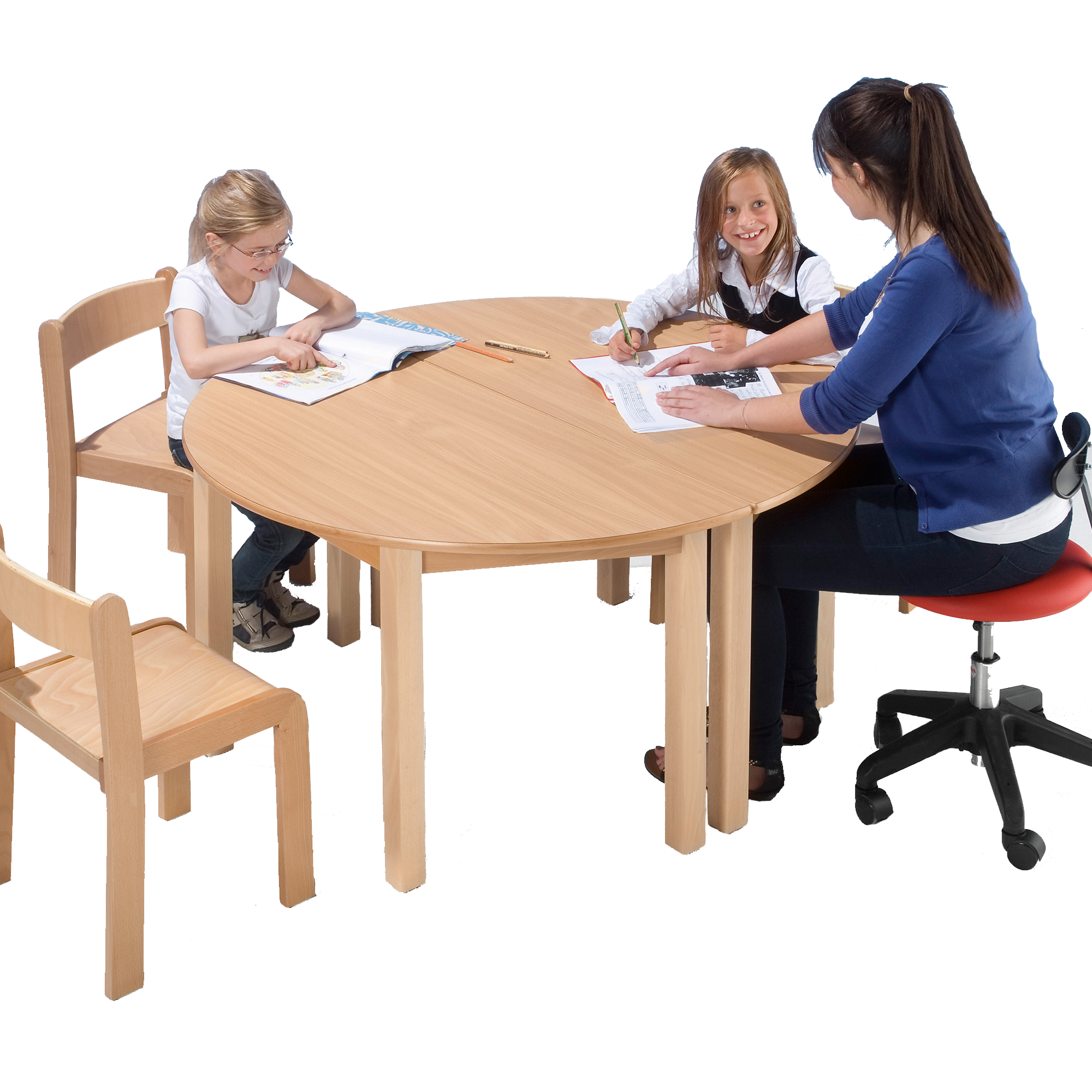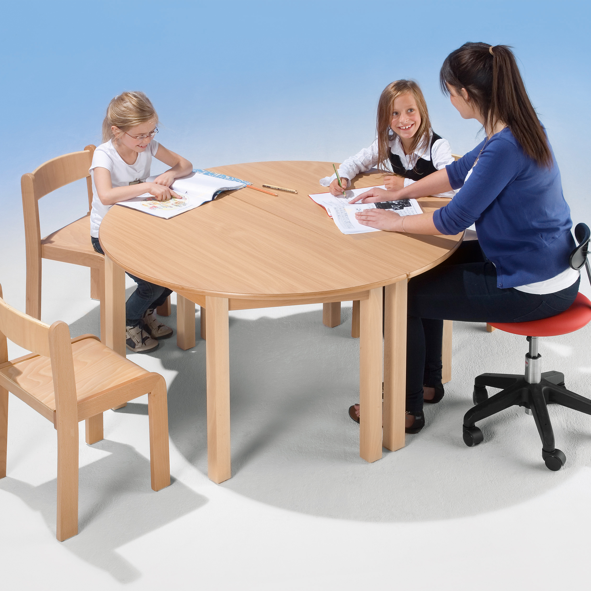 De poten en het frame van deze tafels zijn gemaakt van massief beukenhout. De tafelbladen zijn 19 mm dik en aan beide zijden gelamineerd, de rand bestaat uit een tonvormige, afgeronde massief beukenhouten rand. De zeer resistente en slijtvaste coating is ideaal voor gebruik in kleuterscholen. De tafelpoten worden met dubbele verbindingsbouten stevig in de hoek van het onderstel getrokken. Samen met de stevig verlijmde meenemers (uit vakwerkconstructie) ontstaat een veilige en zeer stabiele hoekverbinding. De verwisselbare tafelpoten hebben nog een voordeel: de tafel kan met je meegroeien. Bestel eenvoudig hogere tafelpoten. Beschikbare opties Vilten glijders "F" Gefreesde tafelonderstellen "A" 2 wielen in een set "TFR"