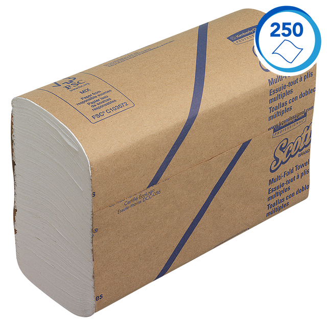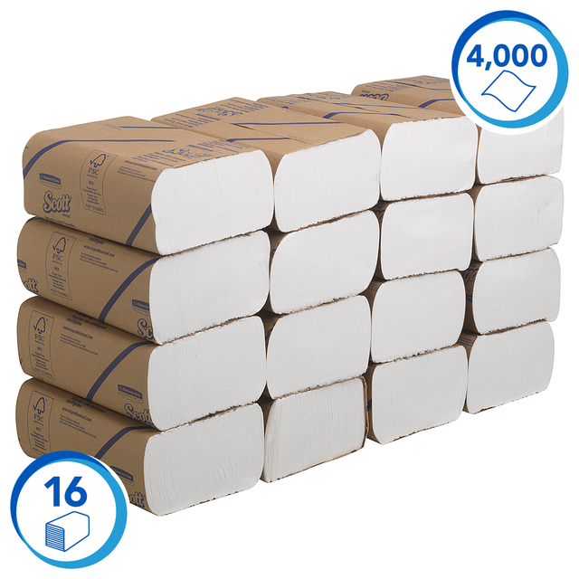 * Scott Papieren handdoekjes 3749 16 pakketten x 250 witte papieren handdoeken (4000 stuks in totaal) * Verbeter de ervaring in uw toiletruimten met vertrouwde Scott®-oplossingen die zijn ontworpen om aan de vereiste reinigings- en hygiënestandaarden te voldoen, zonder in te leveren op kwaliteit of prijs. Kies de topkwaliteit papieren handdoekjes van Scott® voor betrouwbaar drogen in drukke toiletruimten die consistentie en kwaliteit vereisen. * De efficiënt gevouwen handdoekjes drogen uw handen elke dag op betrouwbare wijze en zijn van consistente kwaliteit tegen een betaalbare prijs. * De unieke Airflex™-technologie zorgt ervoor dat elke enkellaagse Scott®-papieren handdoeken absorberend en sterk is, zelfs als deze nat is, zodat u minder hoeft te gebruiken en minder verspilt. Het slimme, meervoudige en transparante ontwerp geeft één papieren handdoekje tegelijk af. Deze doseringsmethode van één vel tegelijk is ontworpen om de handhygiëne te verbeteren door het risico van besmetting tijdens het afdrogen van de handen tot een minimum te beperken. De gebruiker raakt namelijk alleen de gebruikte papieren handdoek aan. De uitgifte van één gevouwen handdoekje voor eenmalig gebruik per keer is ook bedoeld om de gebruikskosten te verlagen, omdat gebruikers alleen de handdoekjes nemen die ze nodig hebben om hun handen af te drogen. * Geschikt voor de Aquarius™ Slimfold™ papieren handdoek Dispenser (productcode U7024). * Deze Scott®-handdoekjes hebben een FSC-certificaat voor milieuzekerheid. * Afmeting bij gevouwen (b x l): 203x80mm. * Afmeting bij ongevouwen (b x l): 203x240mm.