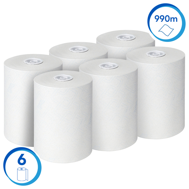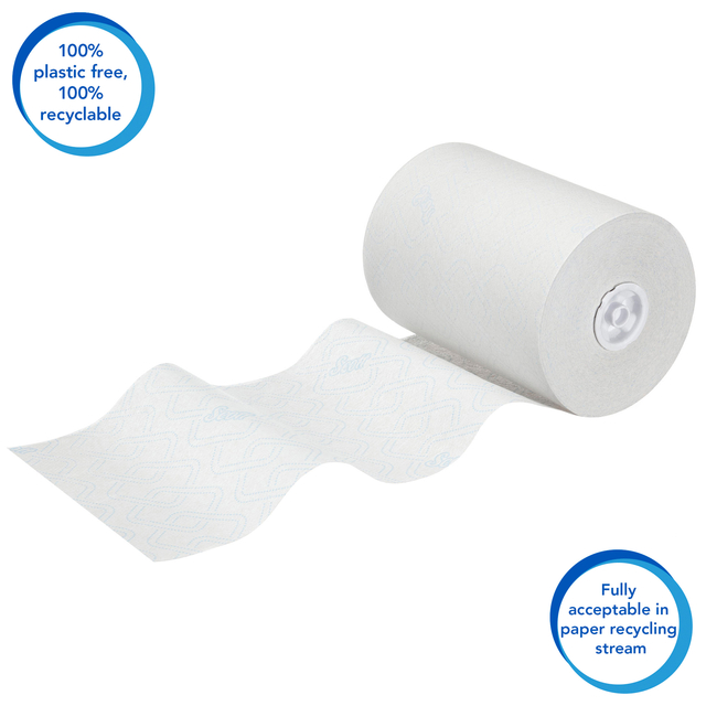 * Scott Control Slimroll Rolhanddoeken 6623 - voor eenmalig gebruik 6 papieren handdoekrollen x 165 m witte papieren handdoeken (990 m in totaal) * Verbeter de ervaring in uw toiletruimten met vertrouwde Scott® Control™-oplossingen die zijn ontworpen om de vereiste reinigings- en hygiënestandaarden te kunnen handhaven. Scott® Control™ Slimroll™ rolhanddoeken zijn ontworpen voor omgevingen met beperkte ruimte waar hygiëne op de werkplek en in de toiletruimte prioriteit heeft. De rollen zachte 1-laags papieren handdoeken met merk in reliëf zijn zacht voor de huid en bieden extra zachtheid bij herhaald drogen van de handen, wat weer bijdraagt aan een betere hygiëne van de handen van het personeel. * Scott® Control™ Slimroll™ handdoeken zijn nu sterker en gaan langer mee. De unieke Airflex™-technologie in de handdoeken voor eenmalig gebruik zorgt voor een superieur absorptievermogen, waardoor de handen efficiënt en effectief kunnen worden gedroogd met minder afval. * Deze Scott® Control™ Slimroll™ rolhanddoeken zijn Europees Ecolabel-gecertificeerd en gecertificeerd voor contact met voedingsmiddelen. Ze zijn kunststofvrij, 100% recyclebaar en volledig geaccepteerd in de papierrecyclingstroom dankzij onze biologische kernplug. Onze nieuwe kernplug verwijdert jaarlijks 30,5 ton plastic afval uit het milieu. * De Scott® Control™ Slimroll™ papieren handdoekrollen zijn compatibel met de in één enkele beweging te reinigen Aquarius™ rolhanddoekendispenser in wit (code 7955) of zwart (code 7956), onze meest hygiënsche dispenser op de markt. Deze dispenser is volledig omsloten. Zo kunnen gebruikers alleen de handdoek aanraken die ze gebruiken om hun handen te drogen. * Met onze aanraakvrije dispensers is het risico op kruisbesmetting lager en worden de hygiënevoorschriften nageleefd. De efficiëntie blijft gehandhaafd bij gebruik van de witte papieren handdoeken op rol van Scott® Control™ Slimroll™. * Met de innovatieve vervangingsfunctie van de rol die nooit opraakt in de compatibele handdoekdispensers van Kimberly-Clark™ kunt u een vervangende rol in het systeem plaatsen voordat de oorspronkelijke rol is verbruikt. Dit zorgt voor een soepele overgang tussen rollen zodat afval tot een minimum wordt beperkt en uw gebruiker continu de hygiënestandaarden kan naleven.