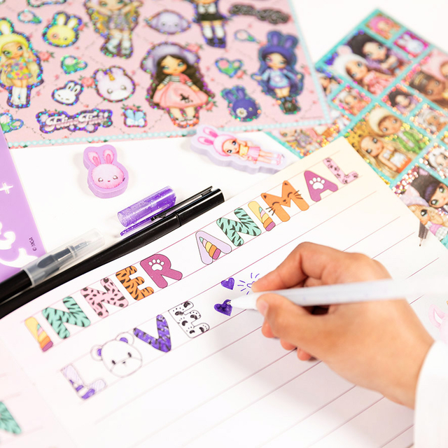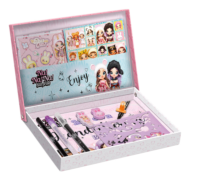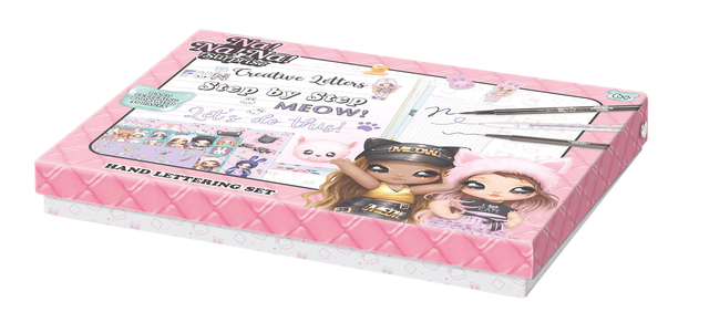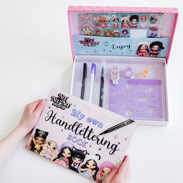 * Na!Na!Na! Surprise Hand lettering set in een handige opbergbox. * In deze set bevinden zich sticker vellen, een stencil met sjablonen, 1 clip, 2 stuks zelf inktende stempelsets, een brush pen, viltstift en een paarse glitter pen om op de juiste manier te handletteren. * Het bijbehorende schrijfboek met duidelijke voorbeelden heeft een formaat van 24x17cm.