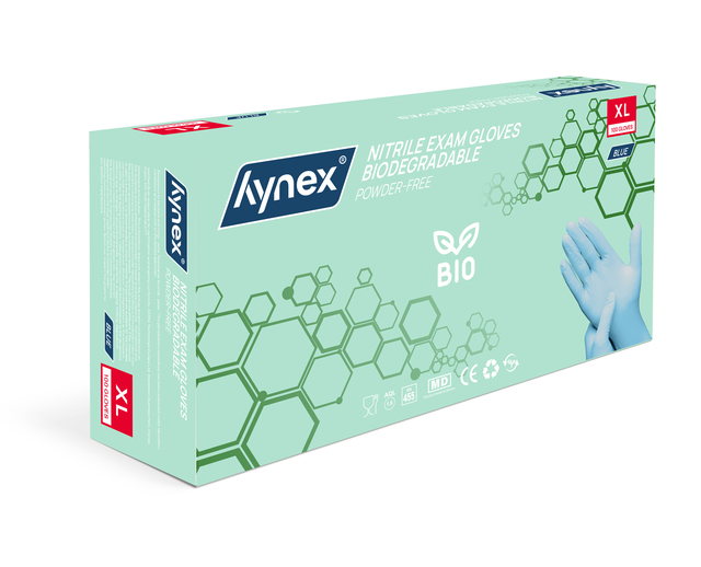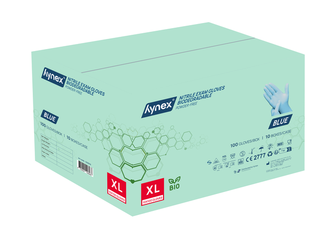 Duurzaam & comfortabel: biologisch afbreekbare nitril wegwerphandschoenen van Hynex Ontdek de nieuwste toevoeging aan het Hynex-assortiment: biologisch afbreekbare nitril wegwerphandschoenen. Met de introductie van deze biologisch afbreekbare handschoenen zetten we een logische stap in onze duurzame koers – zonder concessies te doen aan het ultieme draagcomfort en de optimale bescherming. En zoals je van Hynex gewend bent, geniet je nog steeds van de beste prijs-kwaliteitverhouding. Kies voor milieuvriendelijk gemak, zonder in te leveren op prestaties! Biologisch afbreekbare nitril wegwerphandschoenen De biologisch afbreekbare nitrilhandschoenen vormen een duurzaam alternatief. Dankzij de innovatieve toevoeging van bio-agentia in de formule behouden ze dezelfde betrouwbaarheid als gewone nitril wegwerphandschoenen. Dit betekent dat ze, zodra ze in contact komen met specifieke micro-organismen in de bodem, op natuurlijke wijze worden afgebroken zonder schadelijke resten achter te laten. Voor jouw gebruiksgemak Gemaakt van 100% biologisch afbreekbaar nitril, zijn deze handschoenen poedervrij en oppervlakte-gechloreerd voor extra comfort. Ze bieden een superieure sterkte, verbeterde lekbestendigheid en uitstekende chemische spatbescherming. Nitril heeft als eigenschap dat dit goed vormt naar de hand tijdens gebruik. Hierdoor heb je een goede grip, ook bij het werken in of met natte of geoliede producten of omgevingen. De getextureerde vingertoppen zorgen voor een betere grip bij zowel natte als droge omstandigheden, terwijl ze ook zorgen voor een optimale tastgevoeligheid waardoor ze een precieze aanraking mogelijk maken. Bovendien bieden deze handschoenen betrouwbare bescherming tegen bacteriën en schimmels. De gekrulde rand extra biedt extra gemak bij het aan- en uittrekken, zorgt ervoor dat vloeistoffen niet langs de arm lopen en voorkomt het terugdraaien van de handschoenen. Bovendien zijn ze zowel links als rechts te dragen Sterk en betrouwbaar Nitril wegwerphandschoenen zijn sterker dan latex, rubber of vinyl handschoenen. Ze voorkomen besmettingsgevaar tijdens werkzaamheden waar hygiëne voorschriften belangrijk zijn. Werk je in de voedingsmiddelenindustrie, laboratoria, horeca of zorgsector? Dan zijn deze handschoenen de beste keuze! Nitril voor iedereen Verminder de kans op een latex allergie door puur en alleen nitril handschoenen te gebruiken. Tijdens het gebruik wordt huidirritatie voorkomen doordat de nitril handschoenen latex- en poedervrij zijn. Let op: niet steriel en geschikt voor eenmalig gebruik. Draag wegwerphandschoenen niet te lang, probeer ze elk 2 uur te vervangen voor een nieuw paar. Specificaties:  * Materiaal: Nitril * Ongepoederd & latexvrij * Maat: XL * Kleur: Blauw * Grammage: 3,5 gr * Verpakking: 100 stuks per doos * Niet steriel