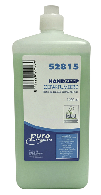 * Euro handzeep voor Ingo-man dispensers. * Euro handzeep, compatible Santral/Ingo-man is een fris geparfumeerde zeep voor dagelijks gebruik in sanitaire ruimtes van bijvoorbeeld scholen, kantoren en horeca gelegenheden. * Fris geparfumeerd. * Heeft een Ecolabel als keurmerk. * Voor dagelijks gebruik. * Zacht voor de handen. . * De elleboog bedienings dispenser van Ingoman is uitermate geschikt voor gebruik in horeca keuken in combinatie met deze zeep. * Past in alle Santral en Ingo-man dispensers van 1000ml.