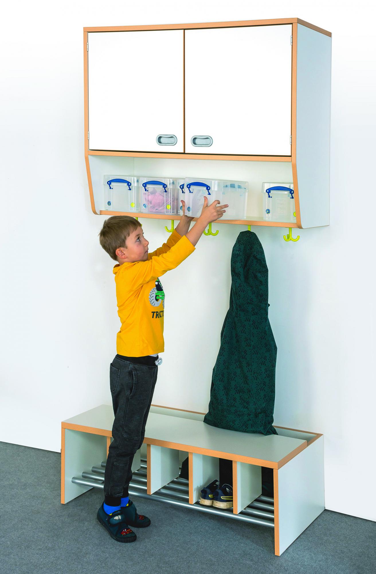 Praktische wandkast voor dubbel gebruik als kapstok en voor opslag. Hij is voorzien van deuren en een plank aan de bovenzijde. In het onderste open vak kunnen handige kunststof bakjes (incl. deksel) worden ondergebracht. De jassen worden opgehangen aan draaibare, stabiele drievoudige plastic haken onder de basis. De kastzijden zijn aan de onderzijde sterk afgerond voor veiligheid en kindvriendelijkheid.