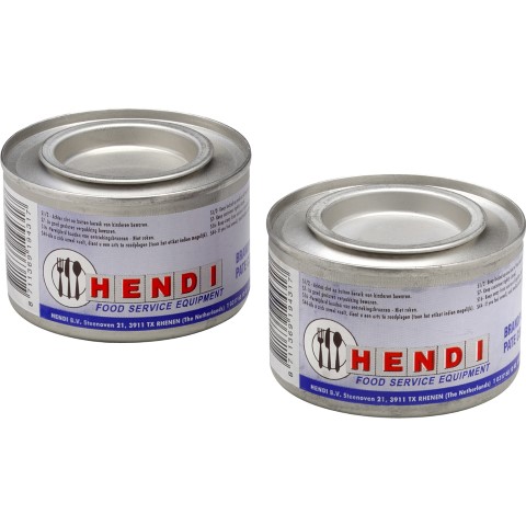 Brandpasta is gemaakt van natuurlijke bio ethanol alcohol gemengd met water en een verdikkingsmiddel. Hendi brandpasta wordt kunstmatig zo bitter gemaakt dat het niet doorgeslikt kan worden. Om veilig en efficient bv. chafing dishes te verhitten adviseren wij met klem altijd speciale brandpasta houders te gebruiken. Hendi biedt de meest voorkomende varianten brandpasta aan. Zij hebben alle hetzelfde brandvermogen de mate van verhitting wordt bepaald door de grootte van de opening van het blikje en het deksel van de brandpasta houder. “Blaze” merk brandpasta brandt korter en intensiever daarom raden wij het aan voor situaties waarin een brandduur van ± 2 uur nodig is. “Hendi” merk brandpasta is beter geschikt voor gebruik van 3 uur of langer. Beide merken branden volledig roet- en geurvrij. Cartouches en blikjes worden snel zeer heet tijdens het gebruik daarom dienen zij altijd in een brandpasta houder geplaatst te worden - dit ter preventie van brand-wonden gevaar Brandpasta houders worden geleverd bij Hendi chafing dishes en zijn ook los verkrijgbaar. Lees voor gebruik altijd de instructies op de verpakking. Let er op dat er geen vuur of hittebronnen in de omgeving zijn wanneer u met brandpasta werkt. Het ontvlambare gas uit de brandpasta kan gemakkelijk uit het blikje ontsnappen. Steek de brandpasta pas aan wanneer de blikjes in de brandpasta houders op de definitieve plaats staan. Zorg ervoor dat er geen condens- water in de brandpasta komt. Dit kan gevaarlijke spetters veroorzaken. De kleur van de vlammen is voornamelijk blauw. Pas op: in lichte omstandigheden zijn zij vrijwel onzichtbaar. Doof de brandpasta alleen met behulp van het deksel van de brandpasta houder. Navullen: Zorg er altijd voor dat het blikje en de houder volledig afgekoeld zijn. Haal het blikje altijd uit de houder zodat er geen brandpasta direct op de houder terecht komt. Verwijder druppels direct met een natte doek. Bewaren: Bewaar brandpasta altijd in gesloten verpakking in een donkere goed geventileerde ruimte koeler dan 20 gr. C. Voor opslag van grotere hoeveelheden dient u de plaatselijke wetten te raadplegen. Als bovenstaande aanwijzingen worden gevolgd is het risico van brand minimaal. In geval van een kleine_beginnende brand: Gebruik een blusdeken of een grote natte gewone deken om het vuur door zuurstofgebrek te doven. In geval van brand op kleding of lichaam: Gebruik een blusdeken poederblusser of CO2 brandblusser. Probeer het vuur nooit te doven met een te kleine handdoek dit zou de brandstof en het vuur alleen verspreiden Koel het lichaam na blussen minstens 15 minuten of tot medische hulp arriveert. Laat kleding aan. Raadpleeg in ieder geval altijd medische hulp. 200 grams blikje voor chafing dish. Brandduur: ± 3 uu