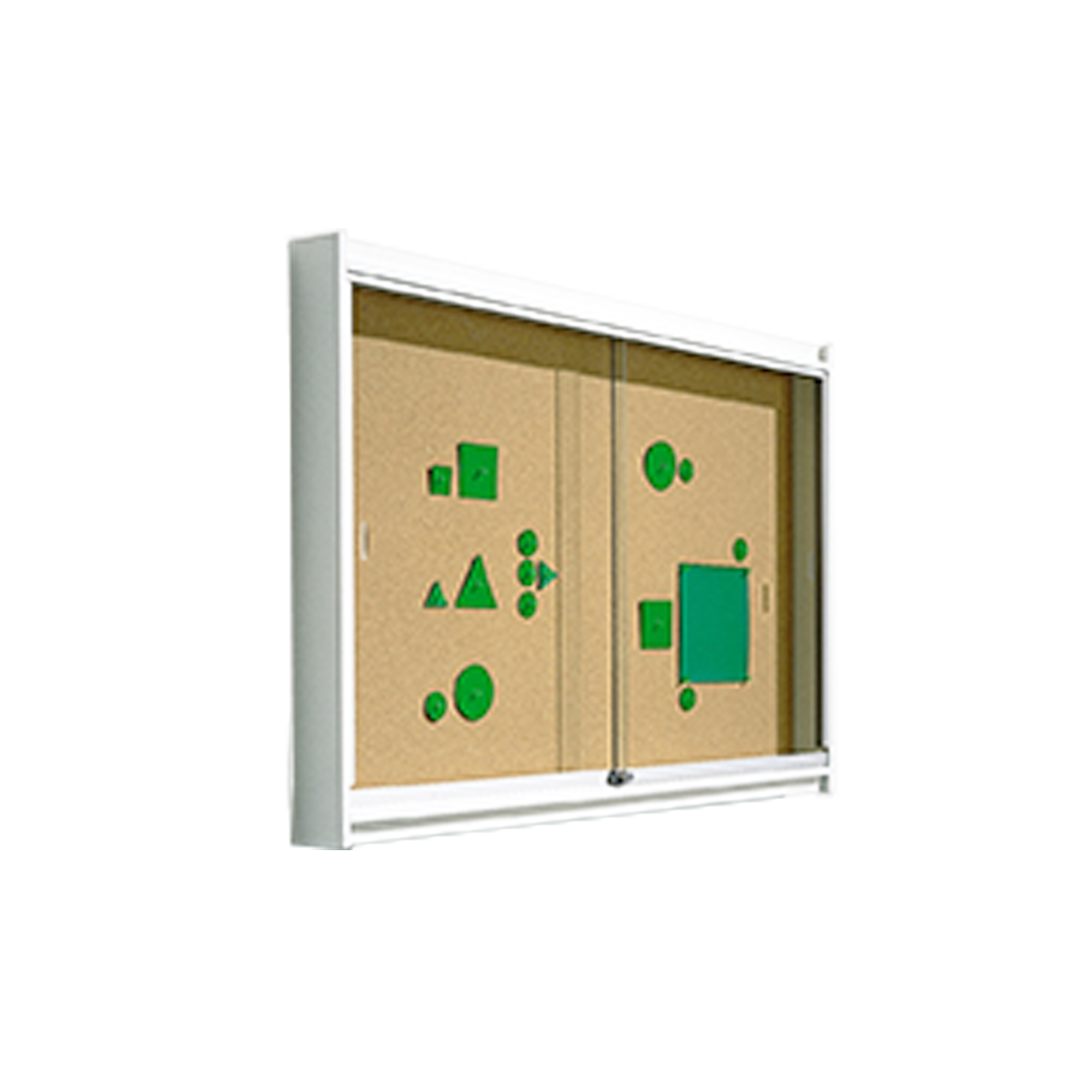 Met onze houten vitrine model IV 1 heeft u de mogelijkheid om uw informatie aan de wand te presenteren. De vitrine is voorzien van schuifdeuren van veiligheidsglas en een veiligheidsdrukcilinderslot waarmee u uw informatie veilig kunt afsluiten. Zowel de breedte als het materiaal van de achterwand en het decor zijn vrij te kiezen. De vitrine met witte stalen achterwand is beschrijfbaar met droog uitwisbare whiteboard markers en is tevens magnetisch. Het model met achterwand van natuurkurk geeft u de mogelijkheid om uw informatiemateriaal met punaises te bevestigen. Het model met een achterwand van geëmailleerd staal in groen is beschrijfbaar met krijt en bovendien magnetisch.