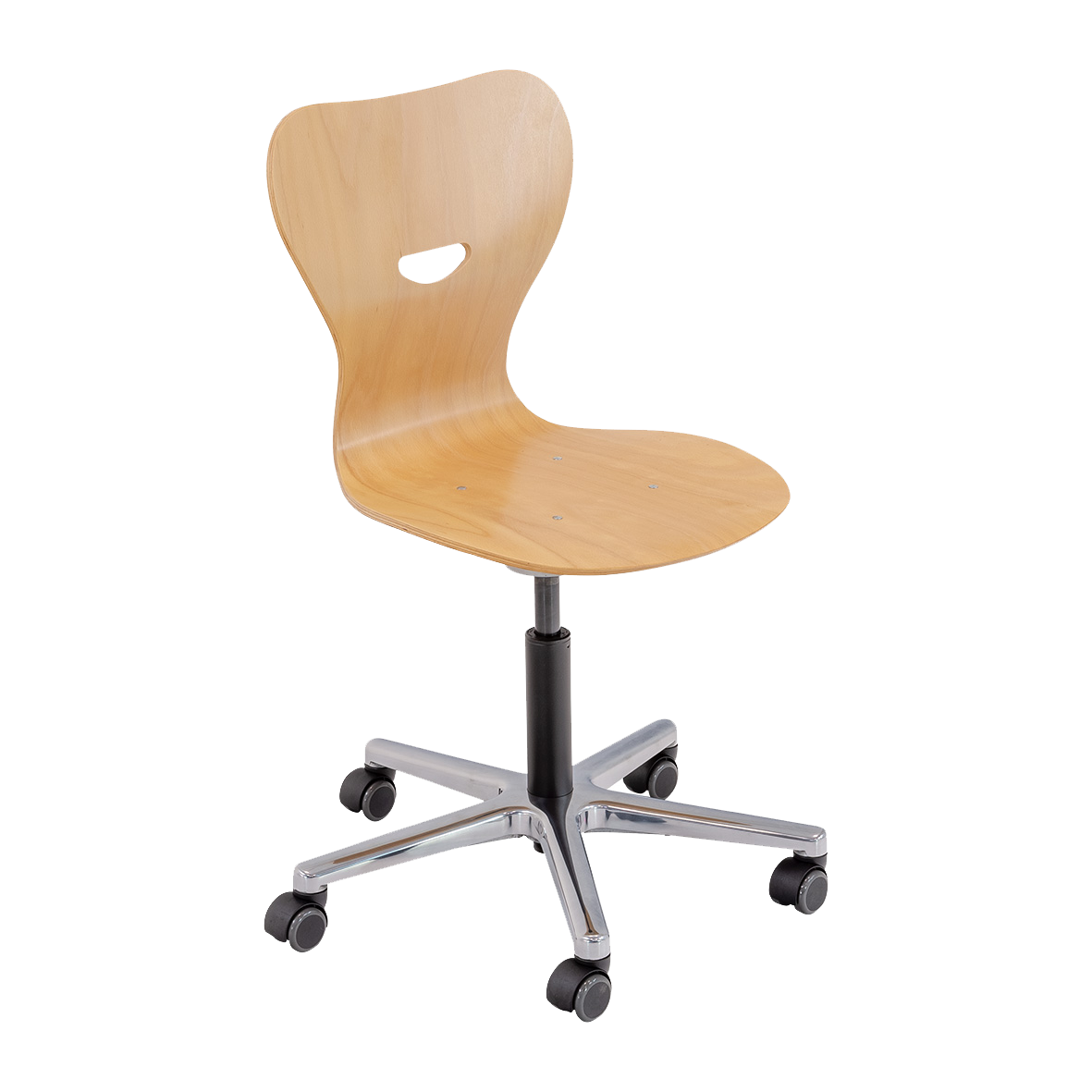 Bureaustoel met ergonomisch gevormde zitschaal van beukenmultiplex, blank gelakt, inclusief handgreepgat. Het glanzend gepolijste aluminium onderstel heeft kunststof voetjes, viltglijders of wieltjes zijn optioneel verkrijgbaar. Afhankelijk van het toepassingsgebied is deze bureaustoel in 3 verschillende zithoogtebereiken te bestellen.