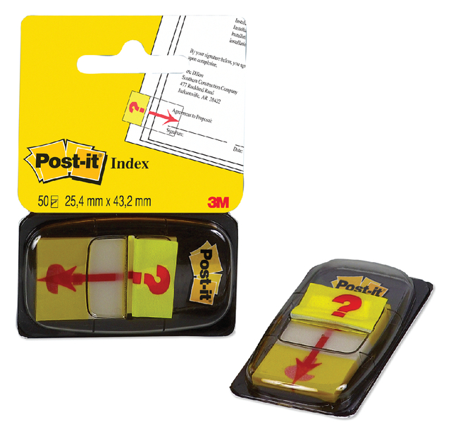 * Post-it® Index om eenvoudig mee te markeren en indexeren of belangrijke info te accentueren. Plakken stevig, zonder resten verwijderbaar en leverbaar in veel verschillende kleuren. Accentueer belangrijke punten of gebruik ze voor indexering, archivering of kleurcodering: thuis, op het werk of op school. * Vind meteen wat je zoekt! Post-it® Index zijn perfect om je documenten te markeren en kleurcodering te geven. * Markeer actiepunten voor een snellere reactie. * De opvallende, kleurige indexmarkers zijn goed zichtbaar, met plaats voor geschreven notities of kopjes. * Herpositioneerbaar: plakken stevig, verwijderen netjes, keer op keer opnieuw te gebruiken. * Maak ordenen stijlvol en leuk. Laat je creativiteit de vrije loop en geef je planner, dagboek of map een nieuw ontwerp. * Geel, 25.4 mm x 43.2 mm, 50 tabs per dispenser, 1 dispenser per verpakking.