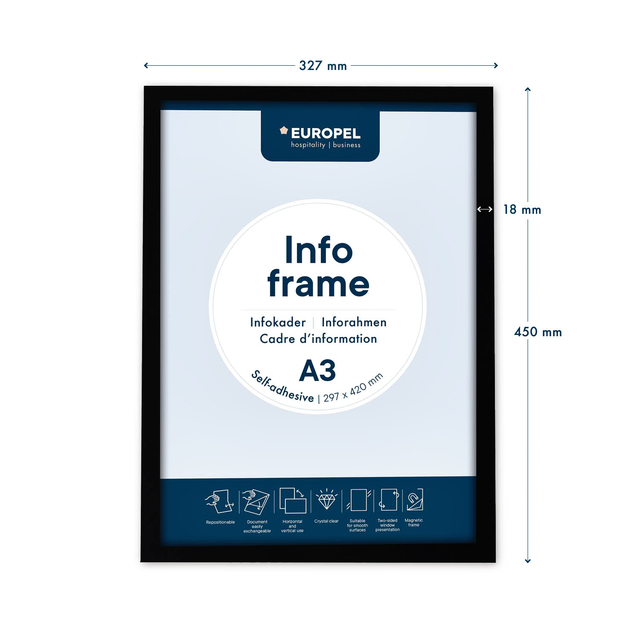 Eigenschappen "Infokader Europel zelfklevend A3 zwart"