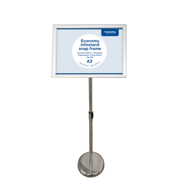 * Versterk uw presentatie met onze veelzijdige en stijlvolle Economy infostand kliklijst! * Deze informatiestandaards zijn ideaal voor beurzen, exposities of de lobby van uw kantoor. * Met een elegante afwerking in zilver, past dit display naadloos in elke professionele omgeving. * Verstelbaarheid: De hoogte van de standaard is gemakkelijk aan te passen, waardoor deze perfect is voor elke gebruiker of situatie. * Stabiele basis: Voorzien van een stevige ronde voet die zorgt voor maximale stabiliteit. * Veelzijdige presentatiemogelijkheden: De kliklijsten zijn draaibaar en kunnen zowel verticaal als horizontaal gepositioneerd worden, wat flexibiliteit in de weergave van uw informatie biedt. * Formaten: Beschikbaar met kliklijsten in de formaten A3 (29,7x42cm) en A4 (21x29,7cm). * Rand frame: De dikte van de rand van de kliklijst is 25mm. * Prijs: Zeer aantrekkelijk en betaalbaar, perfect voor elk budget. * Deze Economy infostand kliklijst is niet alleen functioneel maar ook visueel aantrekkelijk. * Of u nu nieuwe producten wilt introduceren, bedrijfsinformatie wilt delen, of speciale evenementen wilt aankondigen, onze infostand is de perfecte oplossing.