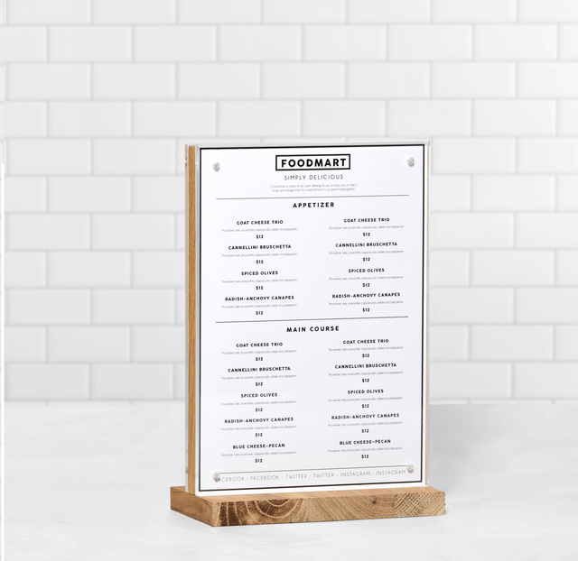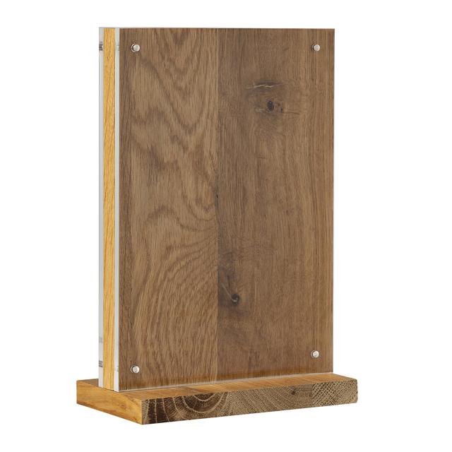 * Luxe kaarthouder Europel voor een representatieve presentatie van folders en prijskaarten. * Met voet en rug uit stevig en duurzaam FSC gecertificeerde eikenhout. * De uit hoogwaardig glashelder acrylaat platen voorzien van 8 sterke onopvallende magneten houden de kaart keurig op zijn plaats en maken het verwisselen van de kaart ook snel en gemakkelijk. * Geschikt voor papierformaat A5 staand.