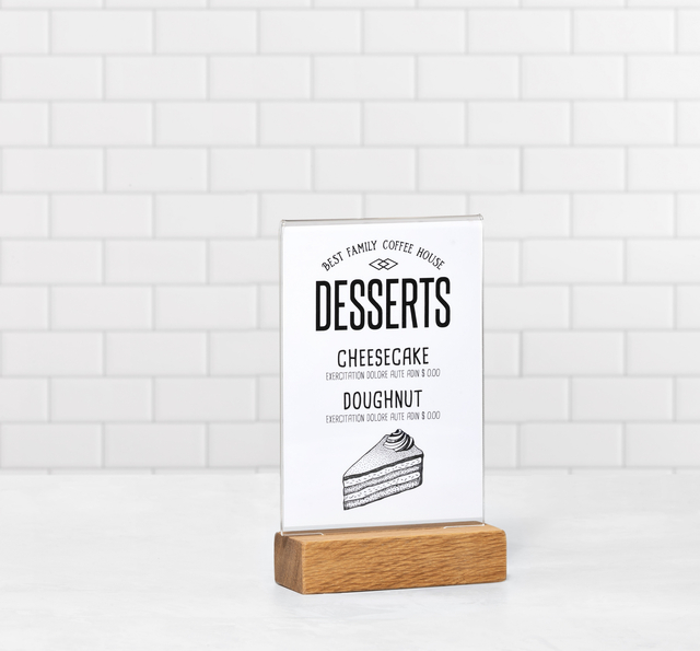 * Kaarthouder Europel voor een representatieve presentatie van folders en prijskaarten. * Met voet uit stevig en duurzaam FSC gecertificeerde eikenhout. * Hoogwaardig glashelder acrylaat. * Geschikt voor papierformaat A6. * Tweezijdige presentatie.