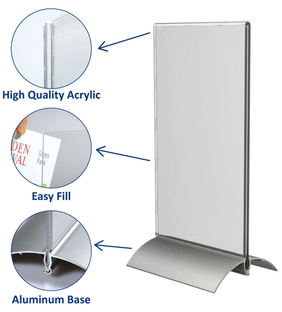 * Kaarthouder voor een glasheldere presentatie van menu- of prijskaarten. * Gemaakt van hoogwaardig glashelder acrylaat. * Voor tweezijdige presentatie. * Voorzien van een hoogwaardig aluminiumvoet. * T-standaard.