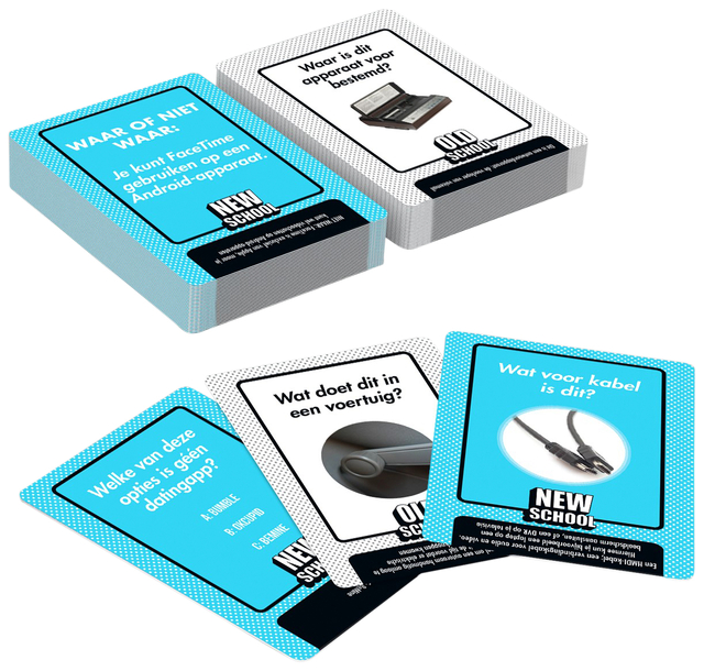 Test je kennis van de populaire cultuur van de generatie van je tegenstander. In een handige pocket editie. Je speelt in teams op basis van generatie. De teams strijden tegen elkaar, waarbij één team de rader is en de andere speler de lezer. De speler met de meeste punten op het eind is de winnaar. 1 team begint als de rader. 1 speler van het andere team, begint als de lezer. De lezer trekt een kaart van de juiste stapel en leest deze hardop voor aan de rader. Als de kaart een afbeelding bevat, moet de lezer ervoor zorgen dat hij het antwoord met zijn hand bedekt en het vervolgens aan de rader laat zien. De raders hebben 30 seconden om onderling te discussiëren voordat ze antwoord geven. Hebben ze de vraag goed dan krijgen zij 1 punt. Hebben ze de vraag fout dan gebeurt er niks en is het andere team aan de beurt als de rader. Old School: Boomers and Gen X – geboren voor 1980. New School: Millenials and Gen Z – geboren in of na 1980.