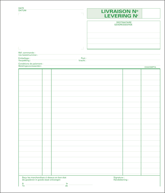 Leveringen 21x18cm 50 blad doorschrijfpapier dupli - Tweetalig Boek met afleveringsbonnen met behoud van een kopie. Voorzien van een eigendomsvoorbehoud clausule.50 genummerde bladen in 2 exemplaren (1 origineel + 1 kopie) Het 1ste blad is micro geperforeerd en is gemakkelijk uit te scheuren, het 2de blad blijft in het boekje De kwaliteit van het zelfkopiërend papier staat garant voor een nette en snelle kopie met een uitstekende transcriptie van het origineel. Dank zij het gebruik van een lijm van superieure kwaliteit en een verstevigde rug, zijn de doorschrijfboeken van Exacompta aangepast aan een veelvuldig gebruik, zowel op kantoor als buiten. 100% Frans fabricaat.