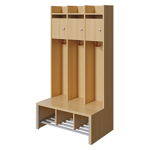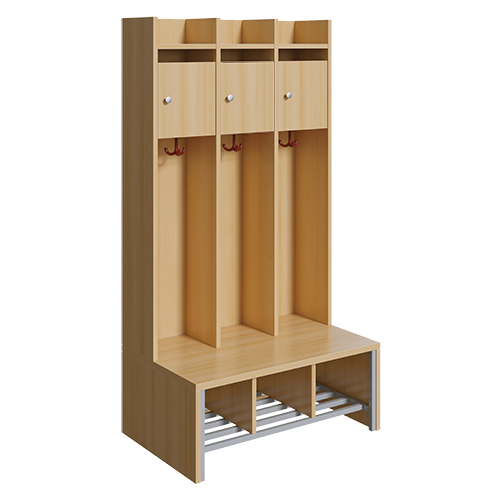 "Overzicht persoonlijke spullen van boven naar beneden, van schoenen tot mutsen" Persoonlijke spullen worden op alle niveaus apart opgeborgen. In de locker-garderobe worden alle dagelijkse wisselkleding overzichtelijk en gestructureerd opgeborgen. De individuele vakafmetingen B/H/D zijn: plank 25 x 10 x 23 cm, klein vak 25 x 31 x 23 cm met deur, jasvak 25 x 81 x 23 cm. De inrichting van de lockerkast is vrij te kiezen, evenals de kleur van de driedubbele haak aan de bovenzijde van het jasvak. De deur heeft een ventilatiespleet en een handgreep, de openingsrichting is selecteerbaar. Schoenen staan droog op het RAL 9006 wit aluminium gepoedercoate schoenenrek, bodemvrijheid 7 cm. Vakmaat B/H/D: 25 x 22 x 53 cm, zitdiepte 30 cm Op verzoek kunnen de deuren ook met andere sloten besteld worden.