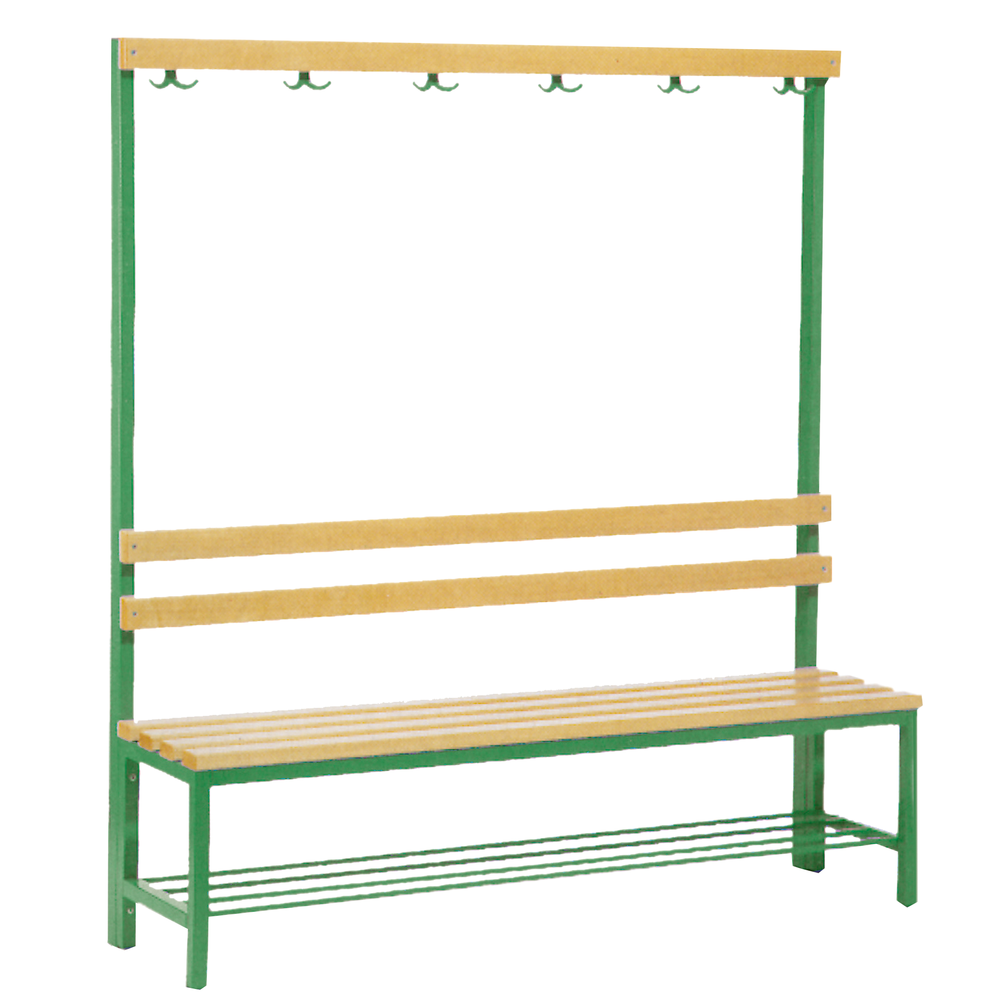 Onze kleedkamerbank met kledingkast is perfect voor in je kleedkamer op school of in de sporthal. Het volledig gelaste frame is gemaakt van vierkante profielstaalbuis (30x30x2mm) Het schoenenrek van vierkante profielstaalbuis (20x20x1,5 mm) biedt voldoende ruimte voor vele paar schoenen. De zitting en rugleuning evenals de afdeklijst zijn gemaakt van geprofileerd hout (60x22 mm) en zijn geverfd met milieuvriendelijke verf op waterbasis. De 6 verborgen dubbele haken van kunststof bieden voldoende mogelijkheden om gymtassen of jassen op te hangen.