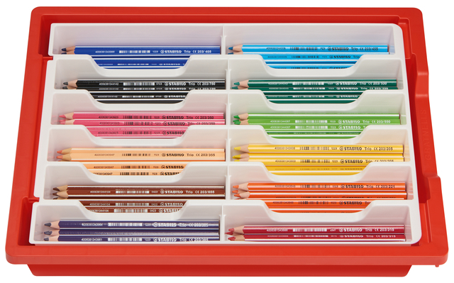 Het STABILO Trio Thick kleurpotlood is ideaal voor kleine kinderen. De dikke driekantige vorm van het potlood biedt een ontspannen grip en moedigt kinderen aan de juiste schrijfhouding aan te nemen. De kleuren zijn zeer intens en de potloden geven zeer gemakkelijk veel kleur af. Driehoekig kleurpotlood STABILO Trio thick Classpack met 96 potloden.