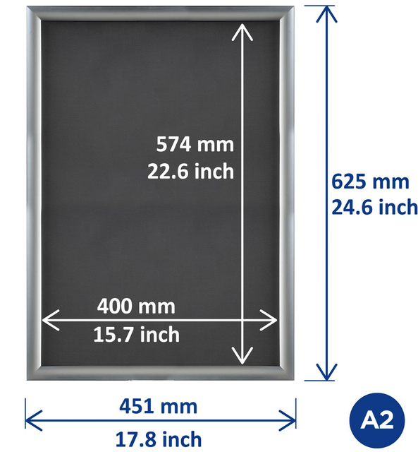Geef je posters een stijlvol podium met onze veelzijdige Europel Premium aluminium kliklijst. Deze hoogwaardige kliklijst, ook bekend als posterlijst of wissellijst, biedt een snelle, eenvoudige en representatieve presentatie van je A2 posters. Belangrijkste kenmerken: * Hoogwaardige kwaliteit: In tegenstelling tot veel andere kliklijsten op de markt, onderscheidt deze kliklijst zich door de premium materialen en afwerking, waardoor hij duurzamer en steviger is. * Easy-Click Systeem: Dankzij het Easy-Click systeem is het presenteren van je boodschap snel, eenvoudig en altijd representatief. * Ontspiegelde voorzetfolie: De heldere, transparante ontspiegelde voorzetfolie beschermt je poster tegen vuil en vocht, terwijl het zorgt voor een heldere en scherpe weergave van je boodschap. * Verstekhoek profiel: Het profiel met verstekhoek geeft de kliklijst een moderne look en draagt bij aan de stabiliteit. * Geschikt voor A2 formaat: Perfect afgestemd op papierformaat A2, maakt deze kliklijst een veelzijdige keuze voor diverse presentaties. Kies de maat die bij jou past! * Frame dikte van 25mm: Met een frame dikte van 25mm valt de kliklijst op, en blijft de aandacht gericht op je poster. * Flexibele ophangmogelijkheden: Hang de lijst zowel horizontaal als verticaal op, afhankelijk van de ruimte en omgeving waarin je deze gebruikt. * Inclusief bevestigingsmateriaal: Het meegeleverde bevestigingsmateriaal, inclusief vier schroeven en vier pluggen, maakt een veilige bevestiging aan de muur mogelijk.