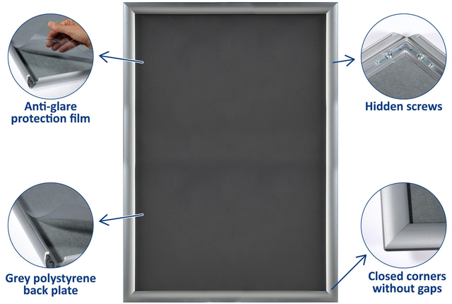 Geef je posters een stijlvol podium met onze veelzijdige Europel Premium aluminium kliklijst. Deze hoogwaardige kliklijst, ook bekend als posterlijst of wissellijst, biedt een snelle, eenvoudige en representatieve presentatie van je B2 posters. Belangrijkste kenmerken: * Hoogwaardige kwaliteit: In tegenstelling tot veel andere kliklijsten op de markt, onderscheidt deze kliklijst zich door de premium materialen en afwerking, waardoor hij duurzamer en steviger is. * Easy-Click Systeem: Dankzij het Easy-Click systeem is het presenteren van je boodschap snel, eenvoudig en altijd representatief. * Ontspiegelde voorzetfolie: De heldere, transparante ontspiegelde voorzetfolie beschermt je poster tegen vuil en vocht, terwijl het zorgt voor een heldere en scherpe weergave van je boodschap. * Verstekhoek profiel: Het profiel met verstekhoek geeft de kliklijst een moderne look en draagt bij aan de stabiliteit. * Geschikt voor B2 formaat: Perfect afgestemd op papierformaat B2, maakt deze kliklijst een veelzijdige keuze voor diverse presentaties. Kies de maat die bij jou past! * Frame dikte van 25mm: Met een frame dikte van 25mm valt de kliklijst op, en blijft de aandacht gericht op je poster. * Flexibele ophangmogelijkheden: Hang de lijst zowel horizontaal als verticaal op, afhankelijk van de ruimte en omgeving waarin je deze gebruikt. * Inclusief bevestigingsmateriaal: Het meegeleverde bevestigingsmateriaal, inclusief vier schroeven en vier pluggen, maakt een veilige bevestiging aan de muur mogelijk.