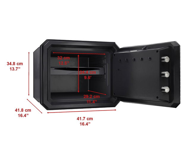 * Kluis met elektronisch combinatieslot. * Brandvrij en waterdicht. * Formaat L. * Inhoud 22,9 liter. * Constructie in staal met bescherming tegen vuur en water. * Bescherming tegen brand van de multimediadragers. * Deur en kast ontworpen om te weerstaan tegen hefboomkrachten. * Vergrendeling van de deur met 3 stalen pennen Ø 2,5 cm. * Programmeerbaar elektronisch combinatieslot met toetsenbord met achterverlichting (werkt op 2 lithiumbatterijen CR123, inbegrepen). * Binnenverlichting. * Verstelbare plank. * Deur met haakjes voor sleutels. * Verankeringskit inbegrepen. * Buitenmaten (hxbxd) 348x417x418mm. * Binnenmaten (hxbxd) 244x320x292mm. * Let op! Dit artikel is extra zwaar, > 25kg en zal met pallet transport verzonden worden. Hier kunnen additionele kosten voor in rekening worden gebracht.