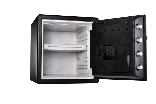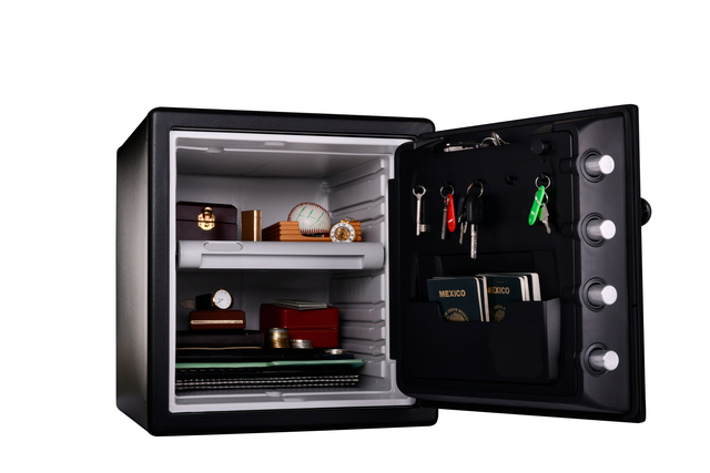 * Kluis met elektronisch combinatieslot. * Brandvrij en waterdicht. * Formaat XL. * Inhoud 33,6 liter. * Constructie in staal met bescherming tegen vuur en water. * Bescherming tegen brand van de multimediadragers. * Deur en kast ontworpen om te weerstaan tegen hefboomkrachten. * Vergrendeling van de deur met 4 stalen pennen Ø 2,5 cm. * Programmeerbaar elektronisch combinatieslot met toetsenbord met achterverlichting (werkt op 4 batterijen "AAA", niet inbegrepen). * Binnenverlichting. * Verstelbaar rek. * Deur met berging en haken voor de sleutels. * Verankeringskit inbegrepen. * Buitenmaten (hxbxd) 453x415x491mm. * Binnenmaten (hxbxd) 349x319x302mm.* Gewicht inclusief verpakking 42,60 kg en zonder verpakking 40.08kg.