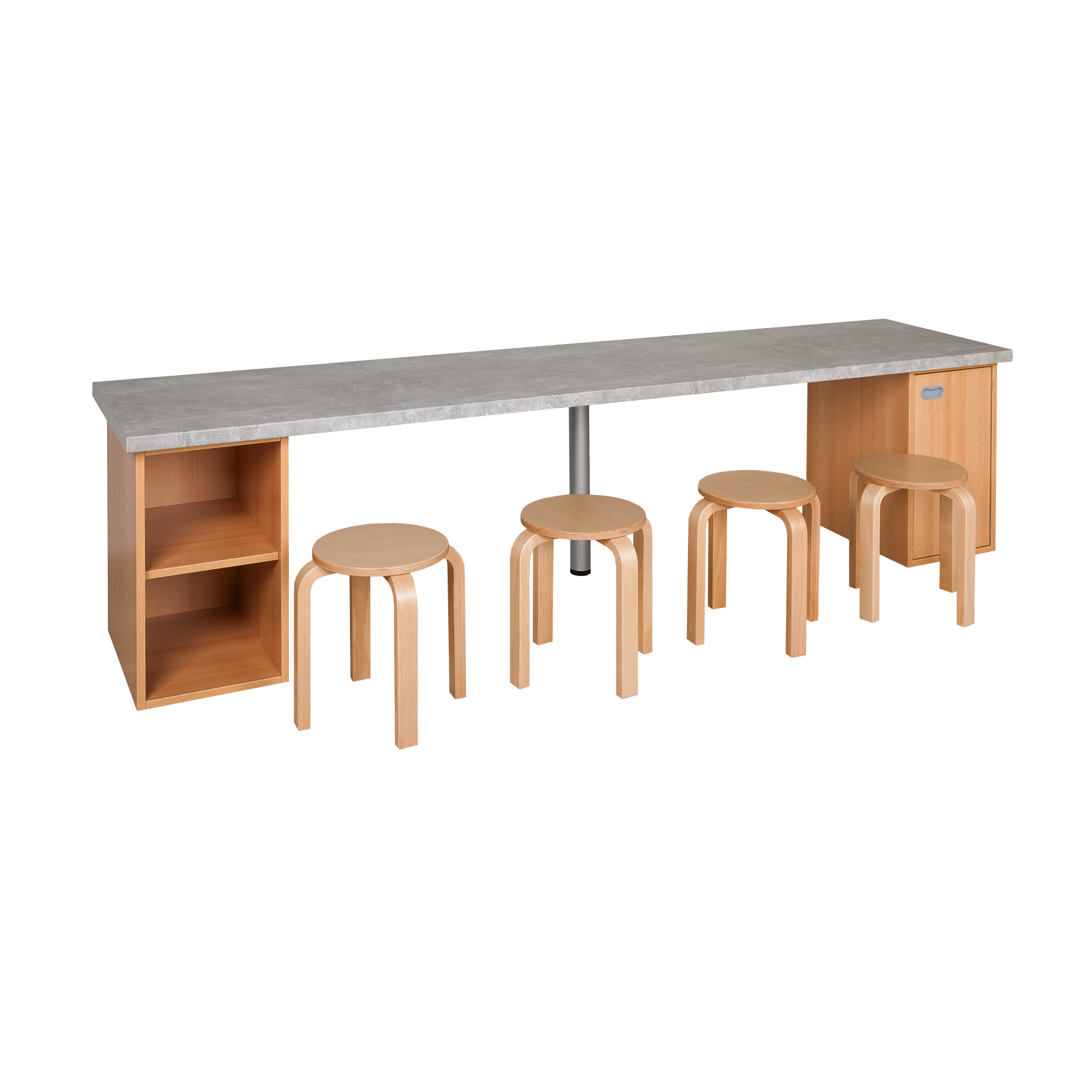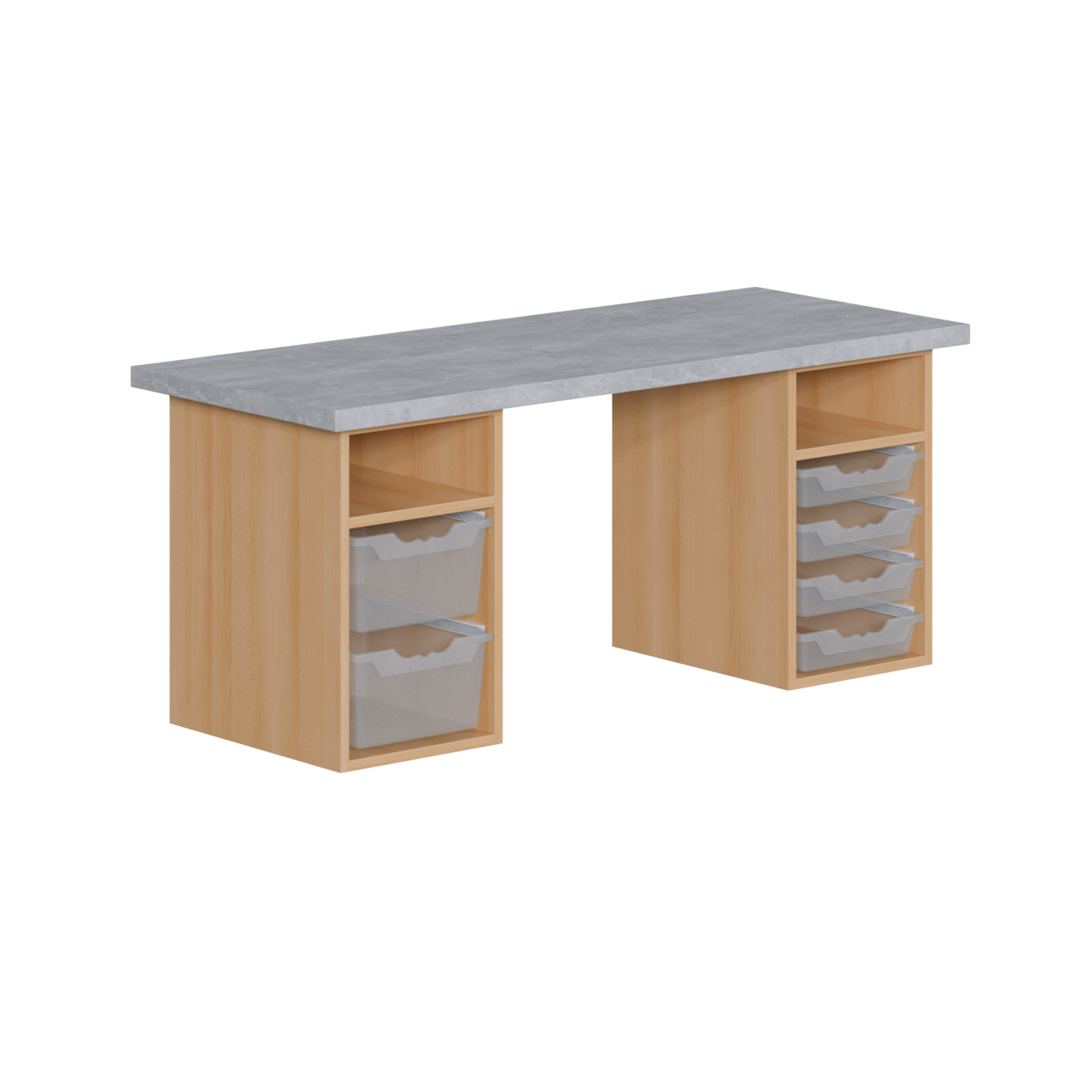 Knutselwerkplekken zijn het ideale startpunt voor de creativiteit van kinderen, beginnend vakmanschap, zelfstandig artistiek productontwerp of zelfs de stabiele basis voor een grote verscheidenheid aan tastbare werk- en knutselprojecten - of eenvoudige leerplantaken! Het stevige, dikke werkblad met de royaal afgeronde voorkant in de kwaliteit van een keukenwerkblad is dankzij de slijtvaste coating zeer mechanisch en chemisch bestendig. Door de opstelling van meerdere werkplekken naast elkaar kunnen de kleine ambachtslieden, kunstenaars en handwerkfreaks elkaar ook helpen of informatie uitwisselen over de status van hun projecten. Afhankelijk van de grootte van de knutselwerkplek bevinden zich onder het werkblad met het decor "Light Atelier" verschillende aantallen kasten met verschillende kenmerken voor het opbergen van materialen en gereedschap - of voor het opbergen van de projecten waaraan wordt gewerkt. Uiteraard is het mogelijk om het decor van de karkassen te kiezen, evenals de kleur van de ErgoTray boxen als deze tot de gewenste uitrusting behoren.
