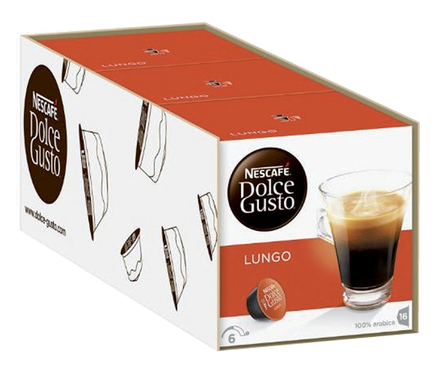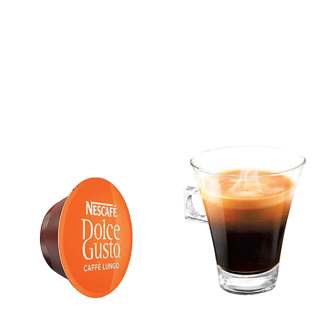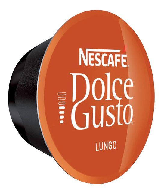 * Dolce Gusto smaken zijn alleen voor koffieliefhebbers. * De lekkerste koffievarianten maak je snel en makkelijk zelf! * Drink je liever een latte macchiato dan espresso of ga je toch voor een warme chocoladedrank? * Het aanbod koffiesmaken is uitgebreid en we hebben voor iedereen wel íets. * Ontdek Nescafe Dolce Gusto Lungo. * Een intense volle medium-dark roast koffie met krachtige aroma's en een rijke cremalaag. * Geniet van de complexe smaak van koffie met een subtiele hint van zwarte bessen. * Lungo is een 100% Arabica-mix van Zuid-Amerikaanse en Oost-Afrikaanse bonen. * De koffiemakers hebben het rooster- en malingsproces precies zo aangepast dat de juiste balans van smaken en aroma's in een capsule van 120ml passen. * Elke doos bevat 16 capsules waarmee je 16 koppen Lungo kunt maken. * Intensiteit 6.