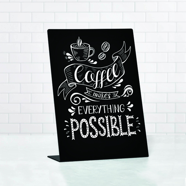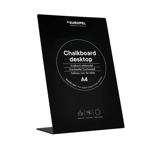 * Krijtbord tafelmodel formaat A4 met geintegreerde stabiele voet. * Gemaakt van hoogwaardig zwart polystyreen. * Eenvoudig te reinigen met een vochtige doek. * Eenzijdige presentatie. * Geschikt voor krijtstiften op waterbasis.