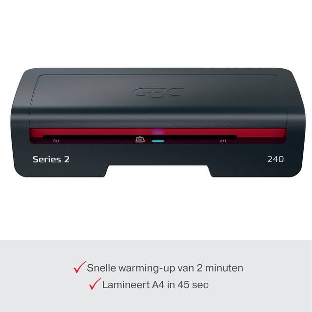De GBC 240 is een slanke en efficiënte oplossing voor je dagelijkse lamineerbehoeften. Deze A4 lamineermachine is ontworpen met zowel stijl als prestaties in gedachten en is ideaal voor gebruik thuis of op kantoor aan huis. Met een snelle opwarmtijd van 2 minuten lamineert hij een A4 vel van 75 micron in slechts 45 seconden, waardoor hij perfect is voor het efficiënt afhandelen van je thuisprojecten. De gebruiksvriendelijke bedieningsschakelaar biedt drie instellingen voor lamineerhoesdikte van 75-125 micron, wat flexibiliteit biedt voor verschillende soorten documenten. Een anti-vastloop ontgrendelingshendel zorgt voor een soepele werking door het moeiteloos oplossen van verkeerd geplaatste lamineerhoezen. Bovendien vereenvoudigt het SMART status ledsysteem de bediening met duidelijke visuele en auditieve signalen: rood tijdens het opwarmen, blauw met een geluid wanneer de machine klaar is en een automatische uitschakeling na 15 minuten inactiviteit om energie te besparen. Bescherm en bewaar je belangrijke documenten met een perfecte afwerking, elke keer weer. * Snelle opwarmtijd, klaar voor gebruik in slechts 2 minuten. * Compatibel met lamineerhoezen van 75 tot 125 micron. * Lamineert van ID-kaart tot A4 documenten. * Lamineert een A4 document (75 mic) in slechts 45 seconden. Lamineert 13x A4 in 10 minuten. * SMART status led: brandt rood tijdens het opwarmen en wordt blauw met een geluidssignaal wanneer de lamineermachine klaar is voor gebruik. * Met de ontgrendelingshendel is het eenvoudig om een vastzittende lamineerhoes met de hand te verwijderen. * Inclusief een startpakket van 5x A4 lamineerhoezen (75 micron). * Bespaar energie met de automatische uitschakeling na 15 minuten inactiviteit. * Laag geluidsniveau <50Dba voor minder afleiding. * Gebruik voor de beste resultaten GBC documenthoezen. * CE-gecertificeerd, TUV/GS.